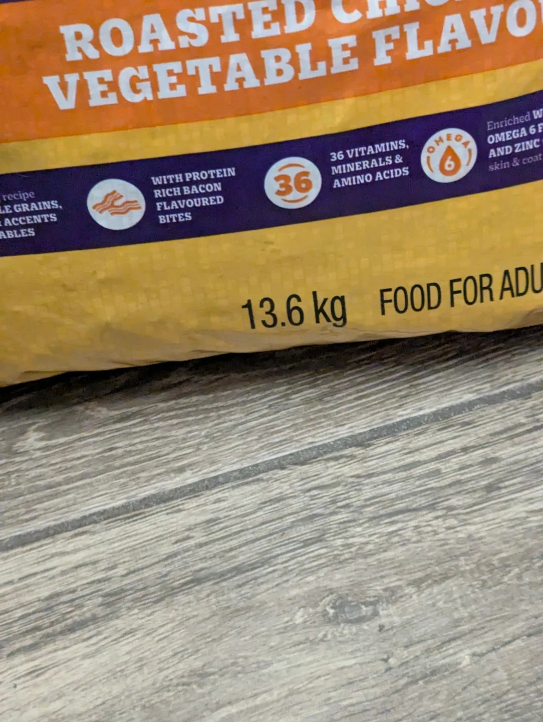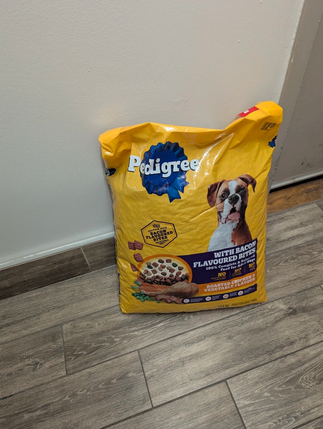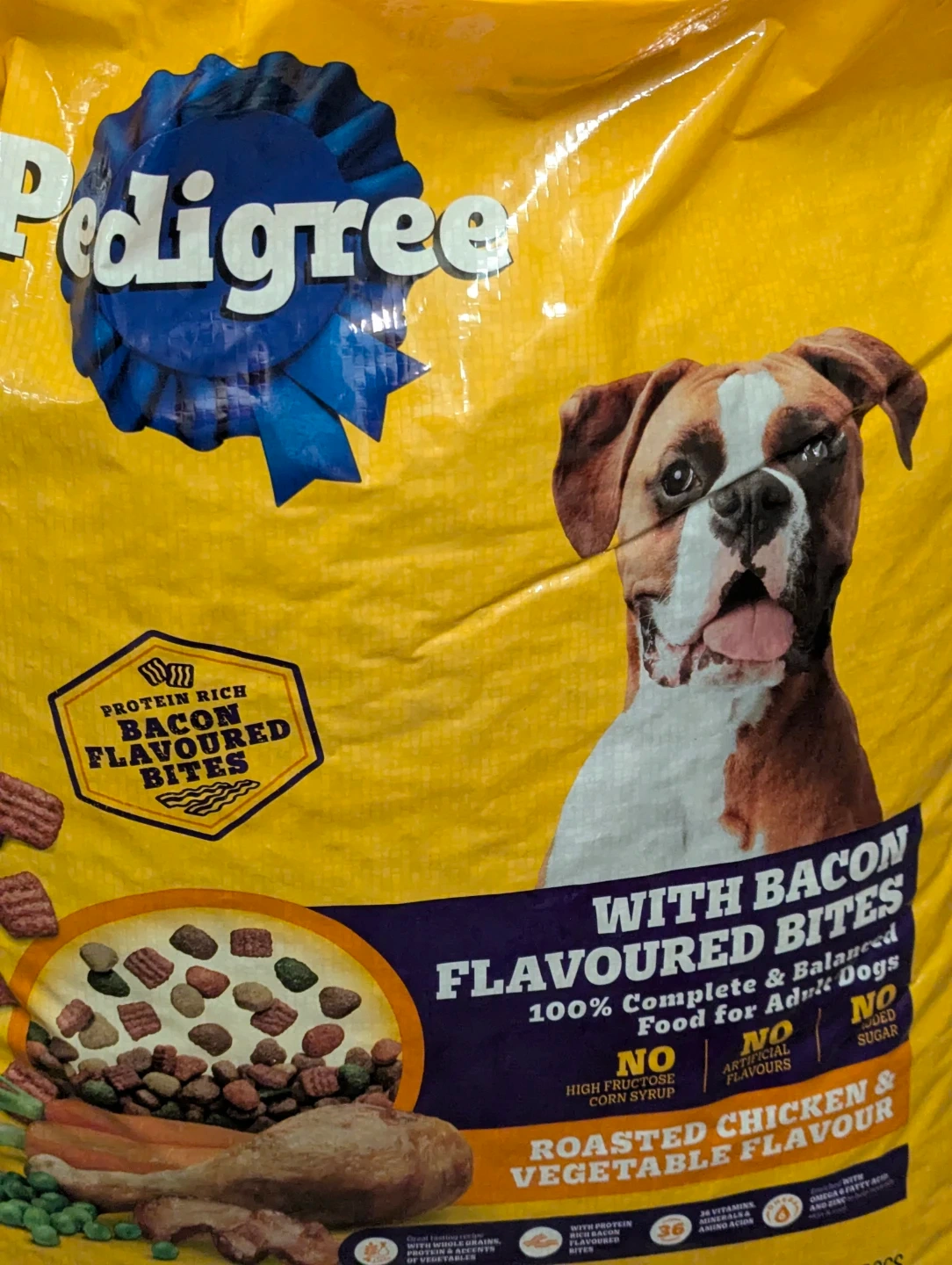 This Pedigree dog food is made with roasted chicken and vegetable flavour and bacon-flavoured bites. It's protein-rich and contains 36 vitamins, minerals, and amino acids. Food is for adult dogs.