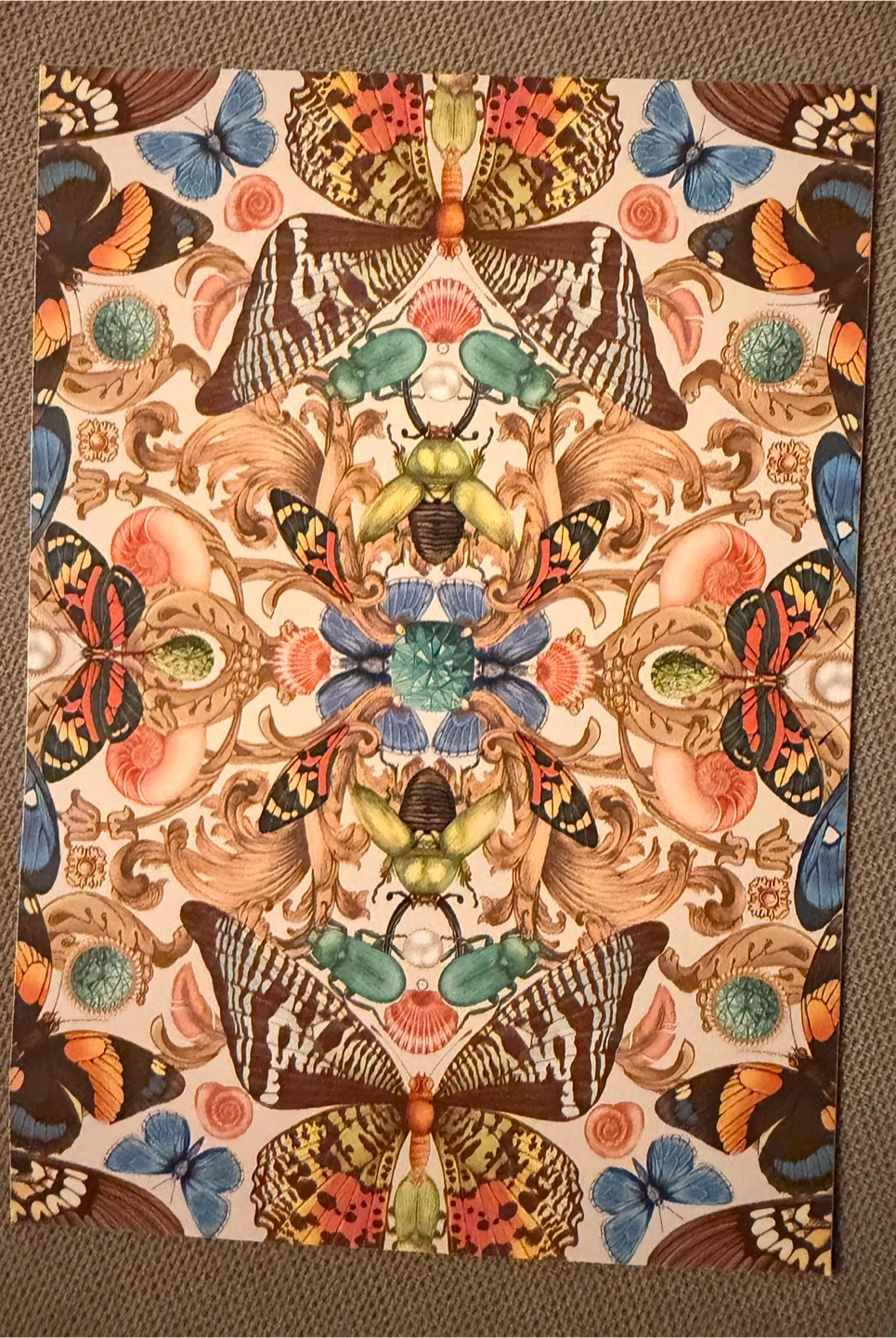 This beautiful silk scarf features a vibrant butterfly and insect print. It's made in England with fine craftsmanship. The scarf comes in its original Emily Carter gift box, perfect for a thoughtful present!