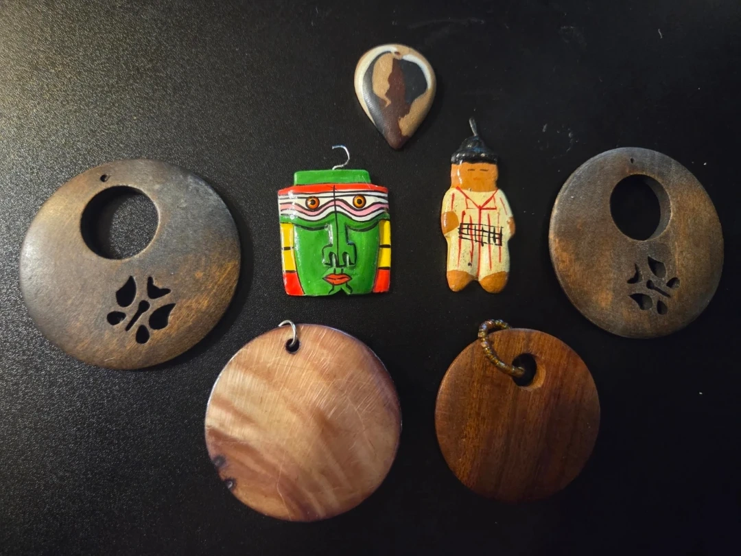 A collection of unique pendants and charms, crafted from wood and shell. Includes two large carved wooden circles, a colourful painted mask, a small carved figure, and a polished shell pendant. Some pieces have holes for jewellery making.