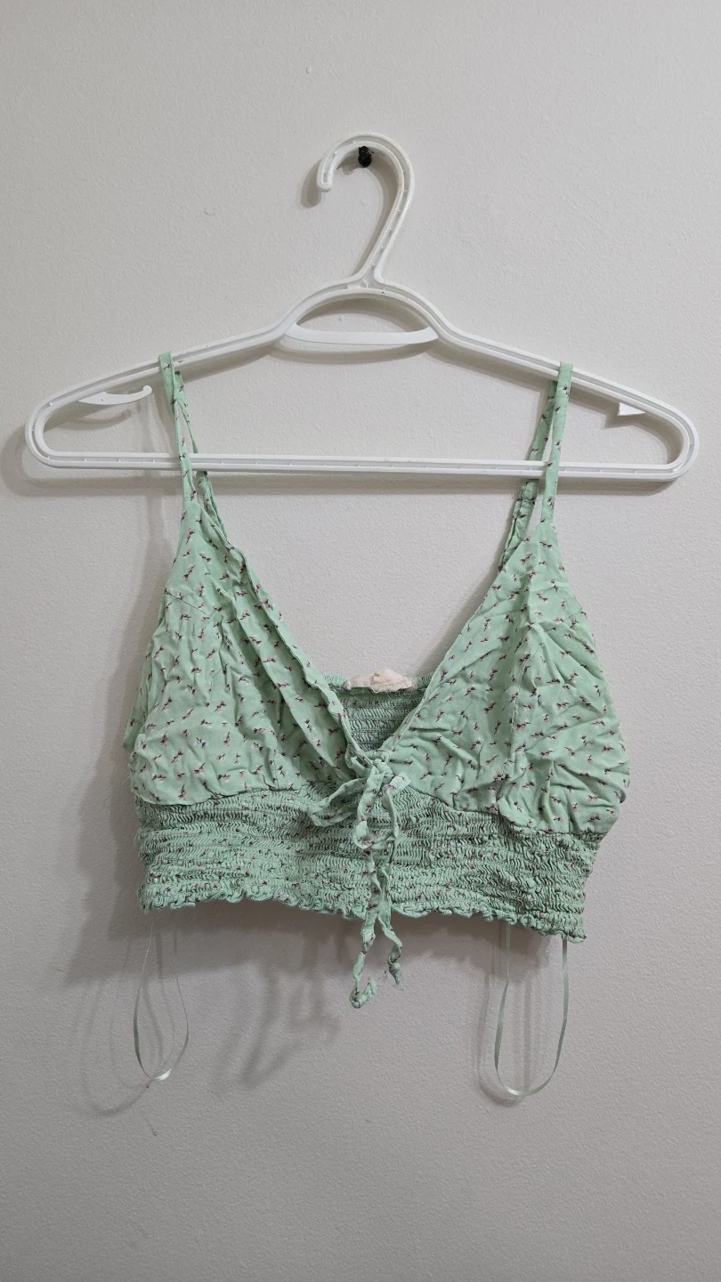 This Aeropostale crop top is a size XL. It's a light green with a floral print and features a smocked back. The fabric is lightweight and has adjustable straps.