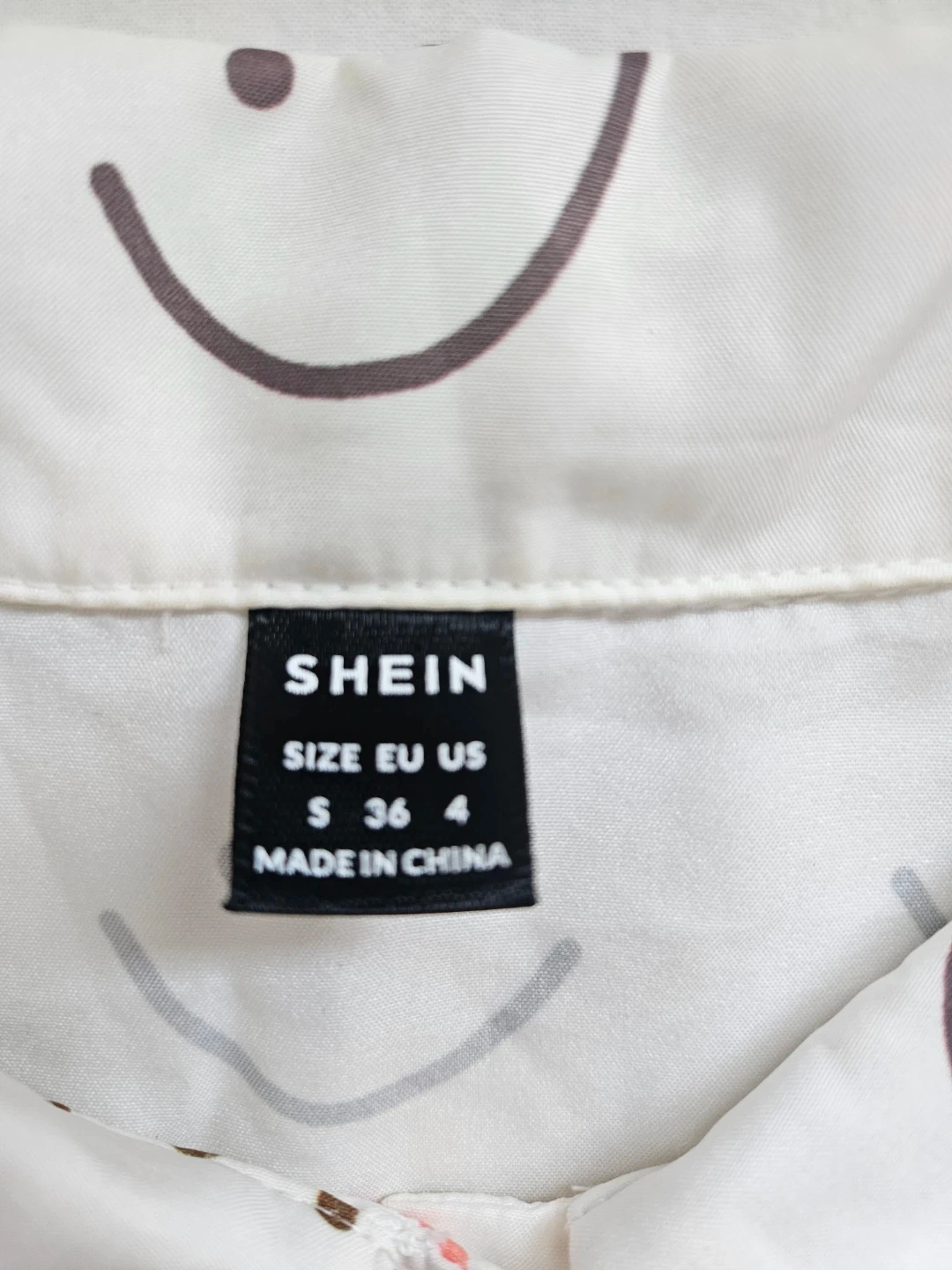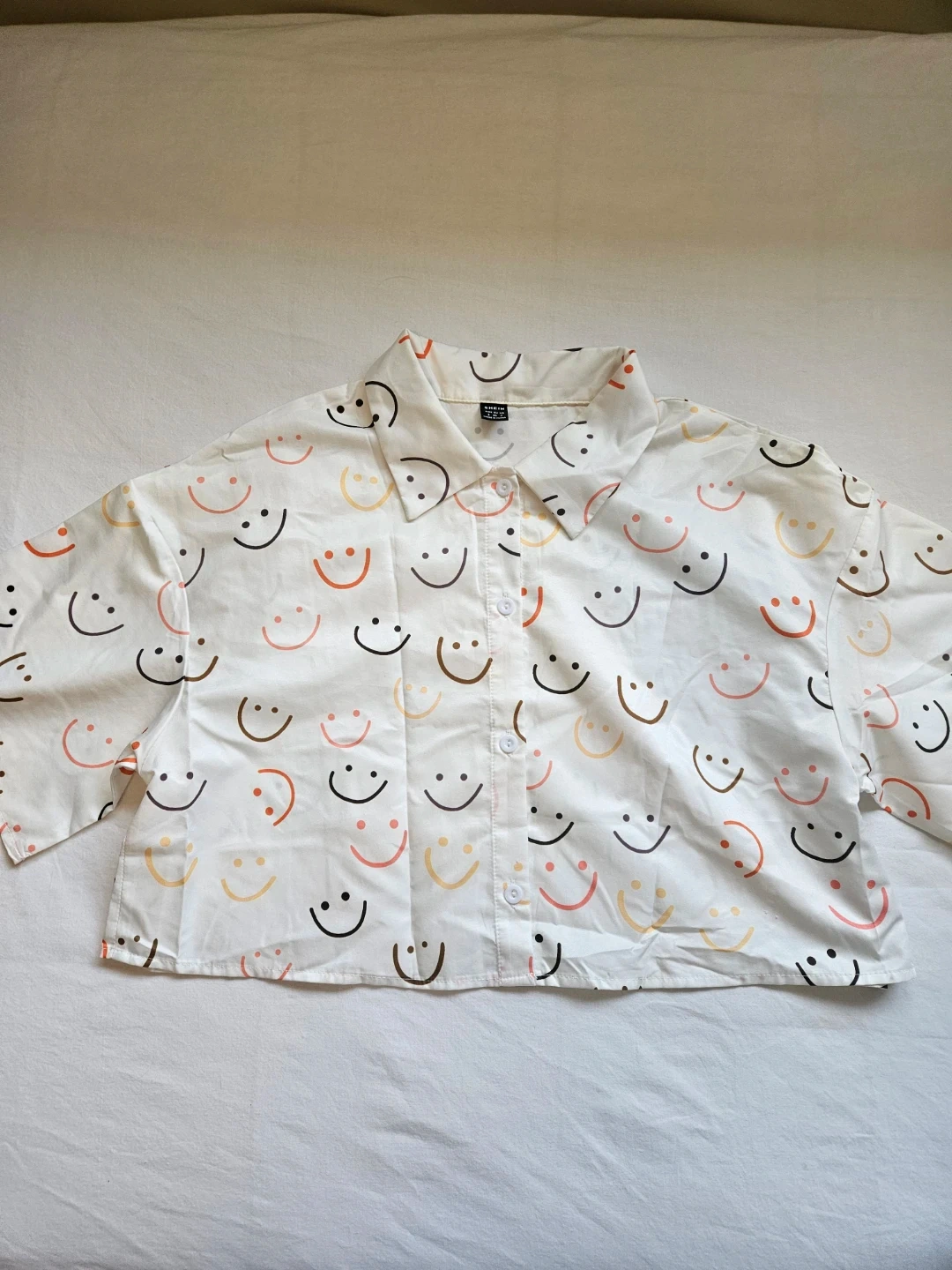This SHEIN crop shirt features a all-over smiley face print. It's a size EU S 36, US 4. The material is lightweight and comfortable.