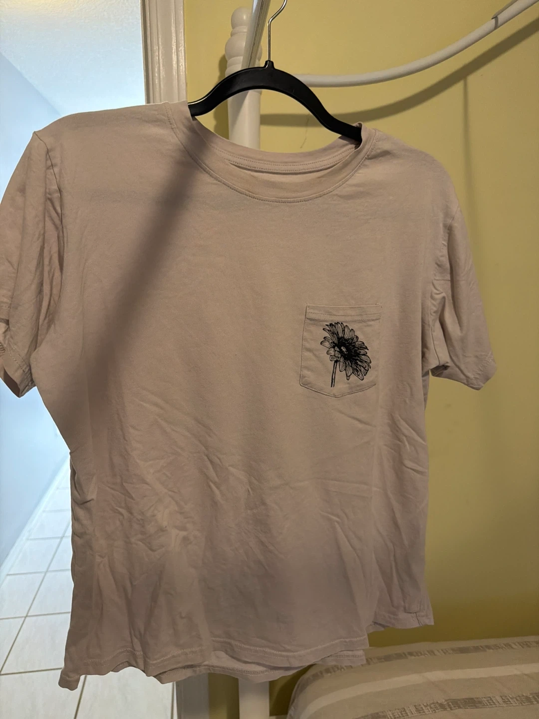 This is a light purple t-shirt with a black floral graphic on the chest pocket. It's made from a soft cotton blend. Great for casual wear any time of year!
