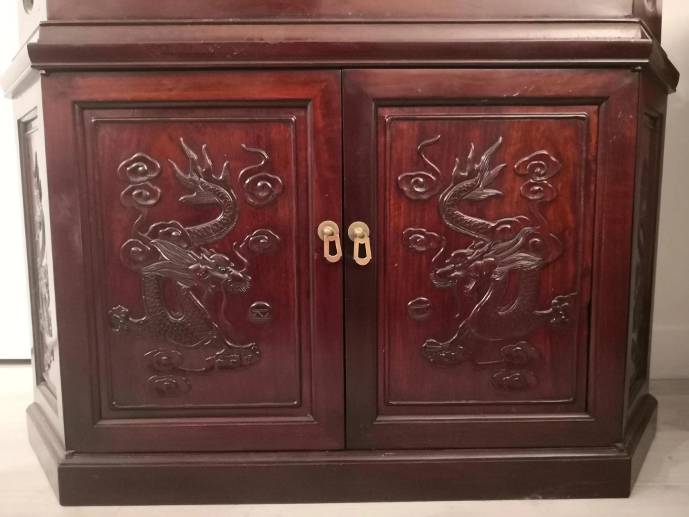 The upper section with the glass door opens to stepped internal shelves and added display light on top. The lower section with twin rectangular paneled and carved dragon doors and enclosing a shelved interior, with plain paneled side and carved dragons.