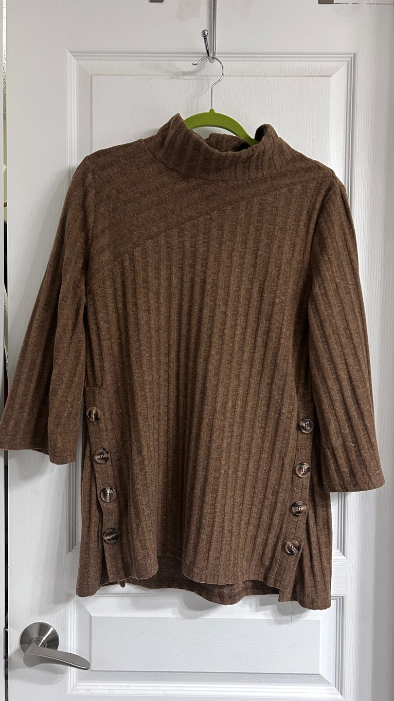 Brown ribbed mock neck top. Three quarter sleeves. Side button detail. Relaxed fit.