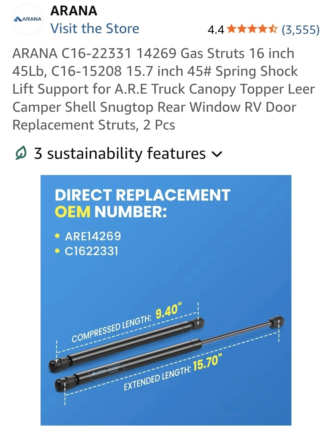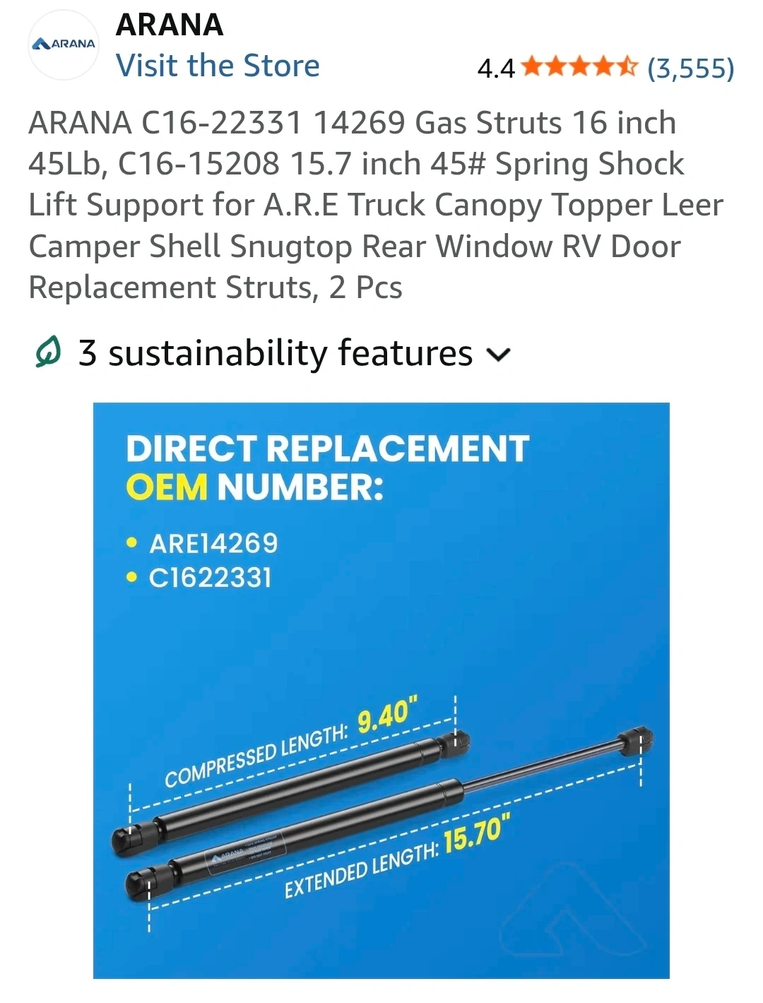 Brand new ARANA gas struts, 16 inches long with a 45lb lift support Including mounting hardware.