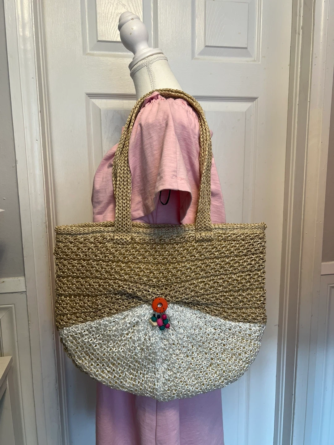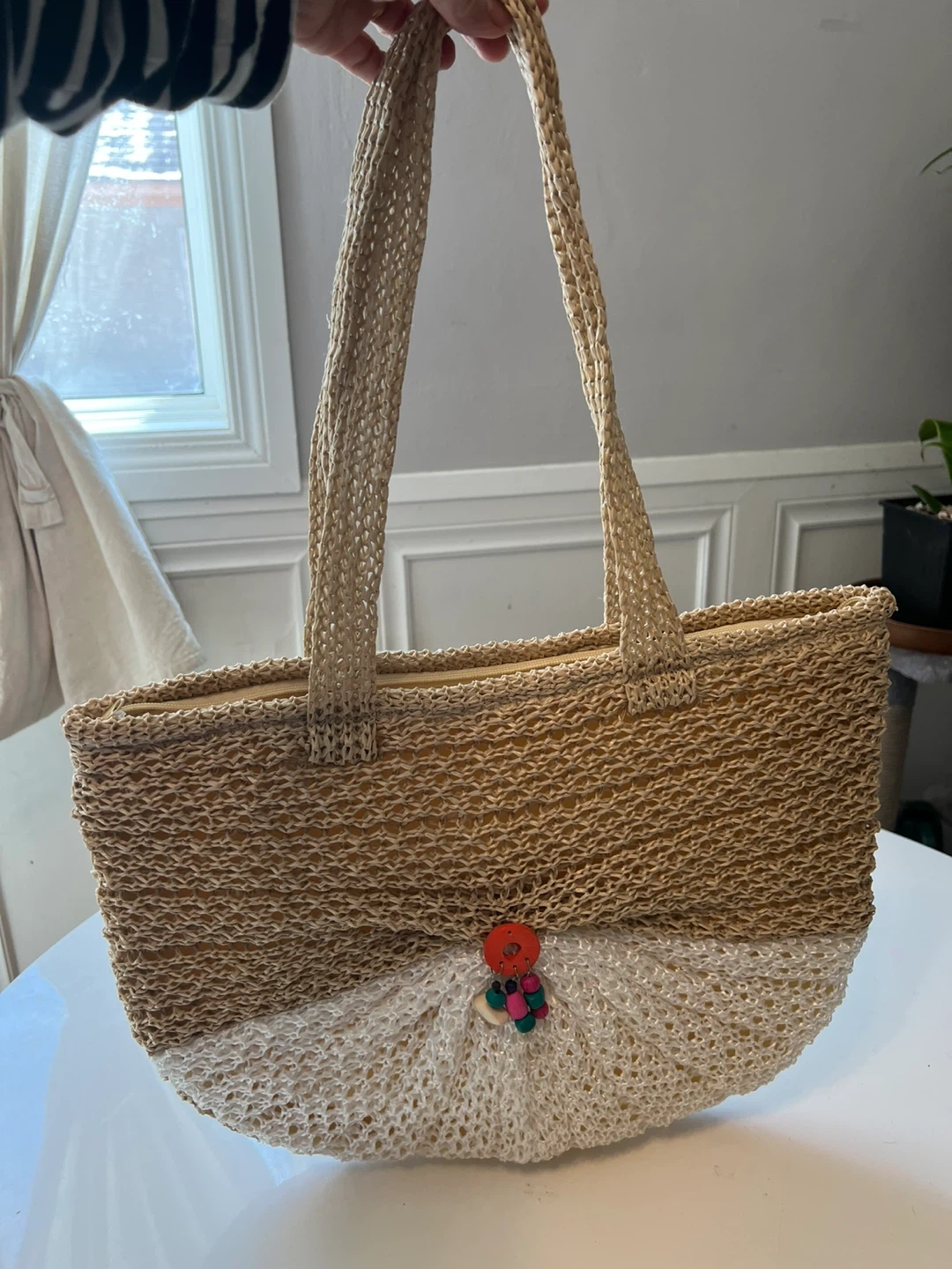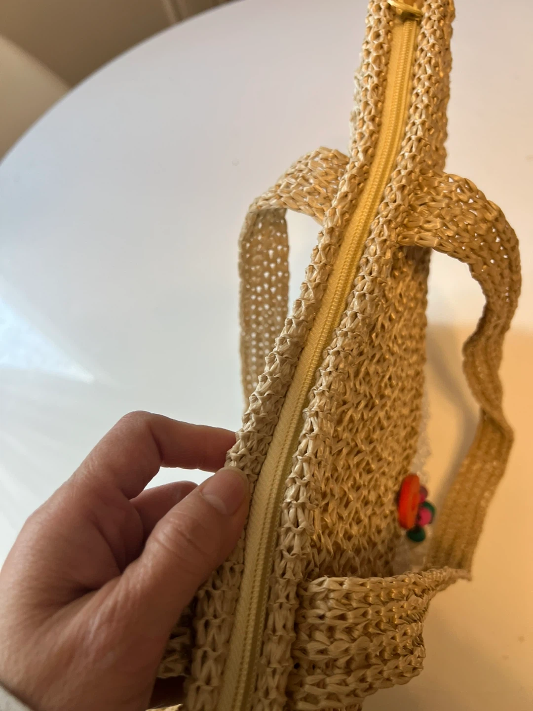 Woven straw tote bag with dual handles and a zip closure. Includes an interior pocket for organization. Features a decorative floral accent on the front. Price is firm. Will give a discount for multiple items.. or free delivery for 3 items or more..$50 minimum., within the city limit.