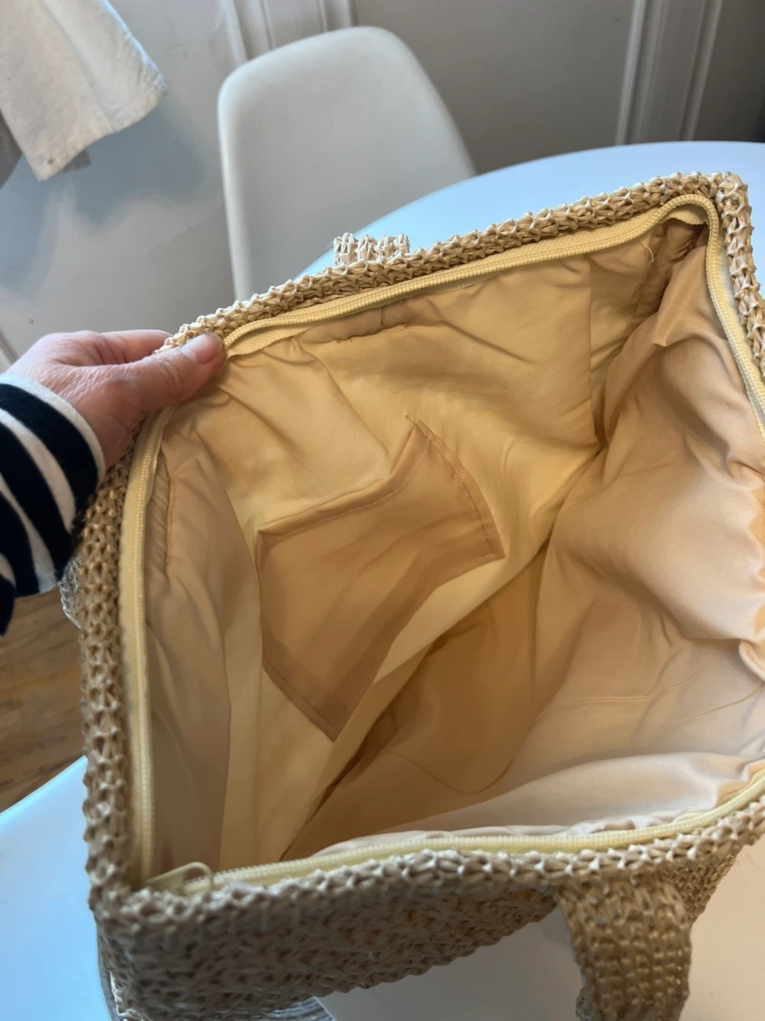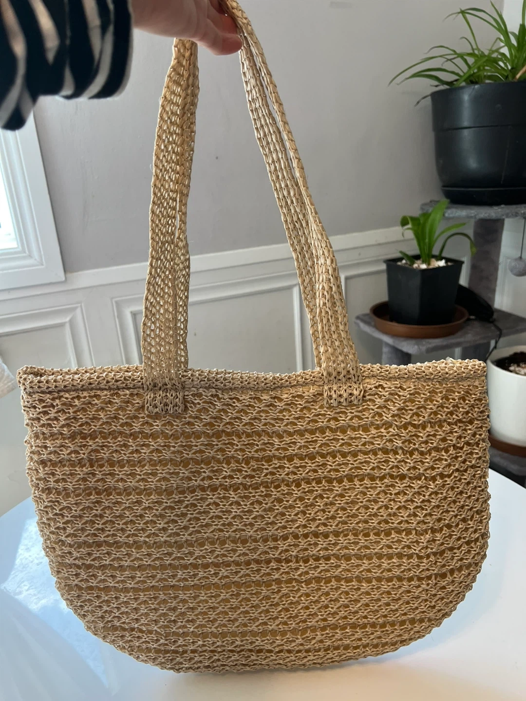 Woven straw tote bag with dual handles and a zip closure. Includes an interior pocket for organization. Features a decorative floral accent on the front. Price is firm. Will give a discount for multiple items.. or free delivery for 3 items or more..$50 minimum., within the city limit.