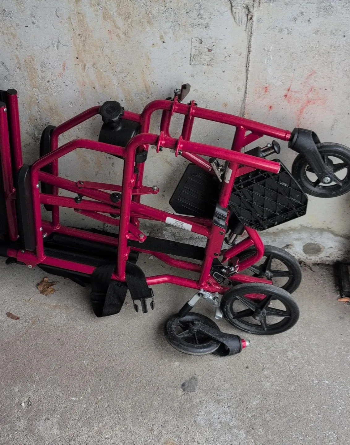 This red folding mobility walker is designed for easy transport. It has four wheels and a basket for carrying items. It's foldable for convenient storage.