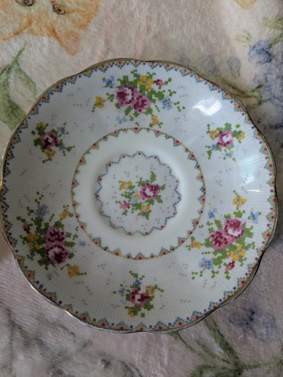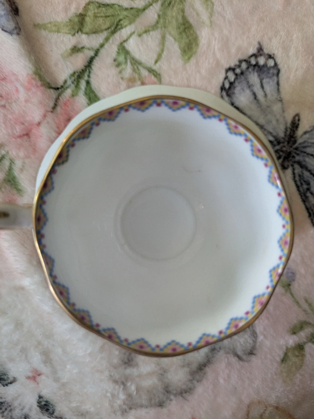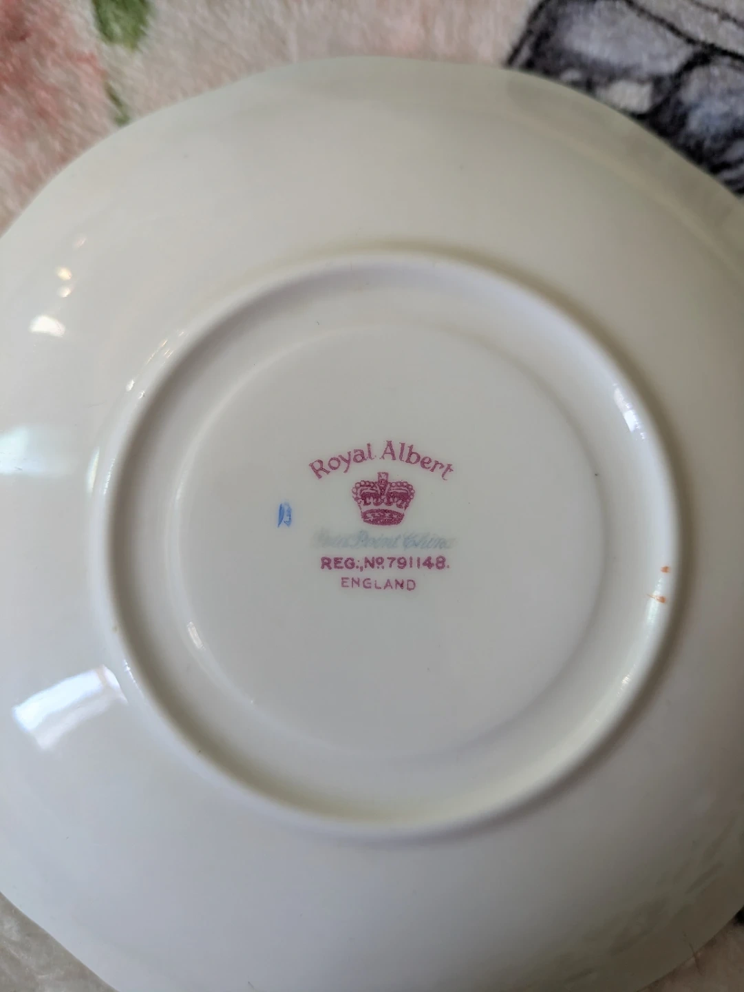 This is a vintage Royal Albert "Forget Me Not" teacup and saucer set from England. It's made of fine bone china with a pretty floral design that resembles cross-stitch. This set is perfect for enjoying a nice cup of tea!