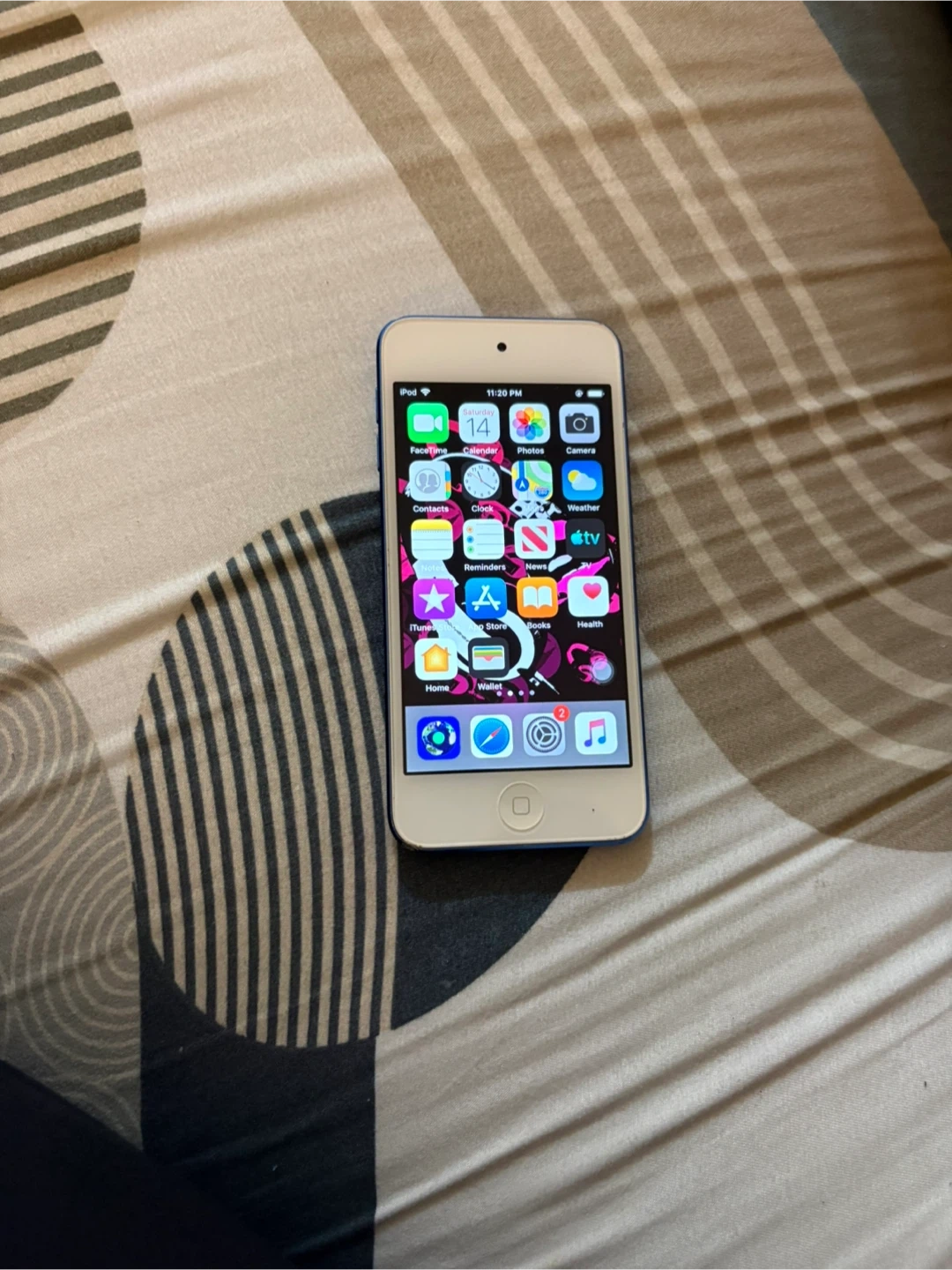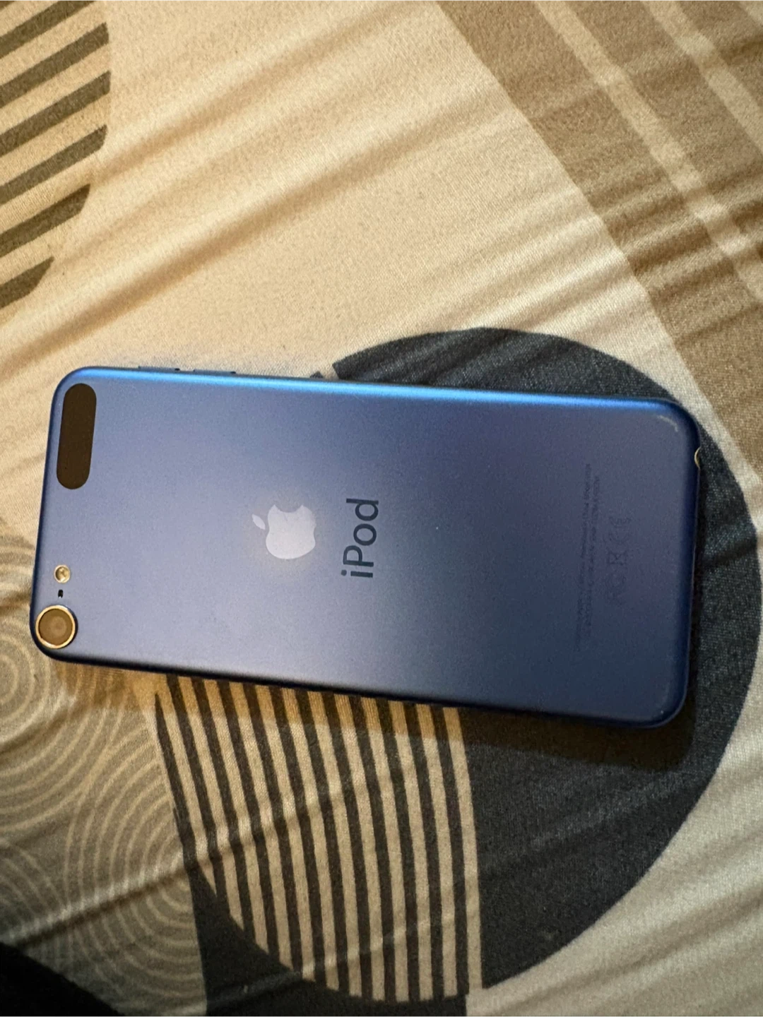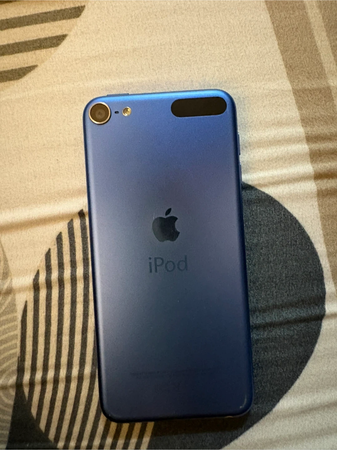 This is an Apple iPod Touch. It's blue on the back and white on the front. It's a great device for music and apps. Some wear is visible.