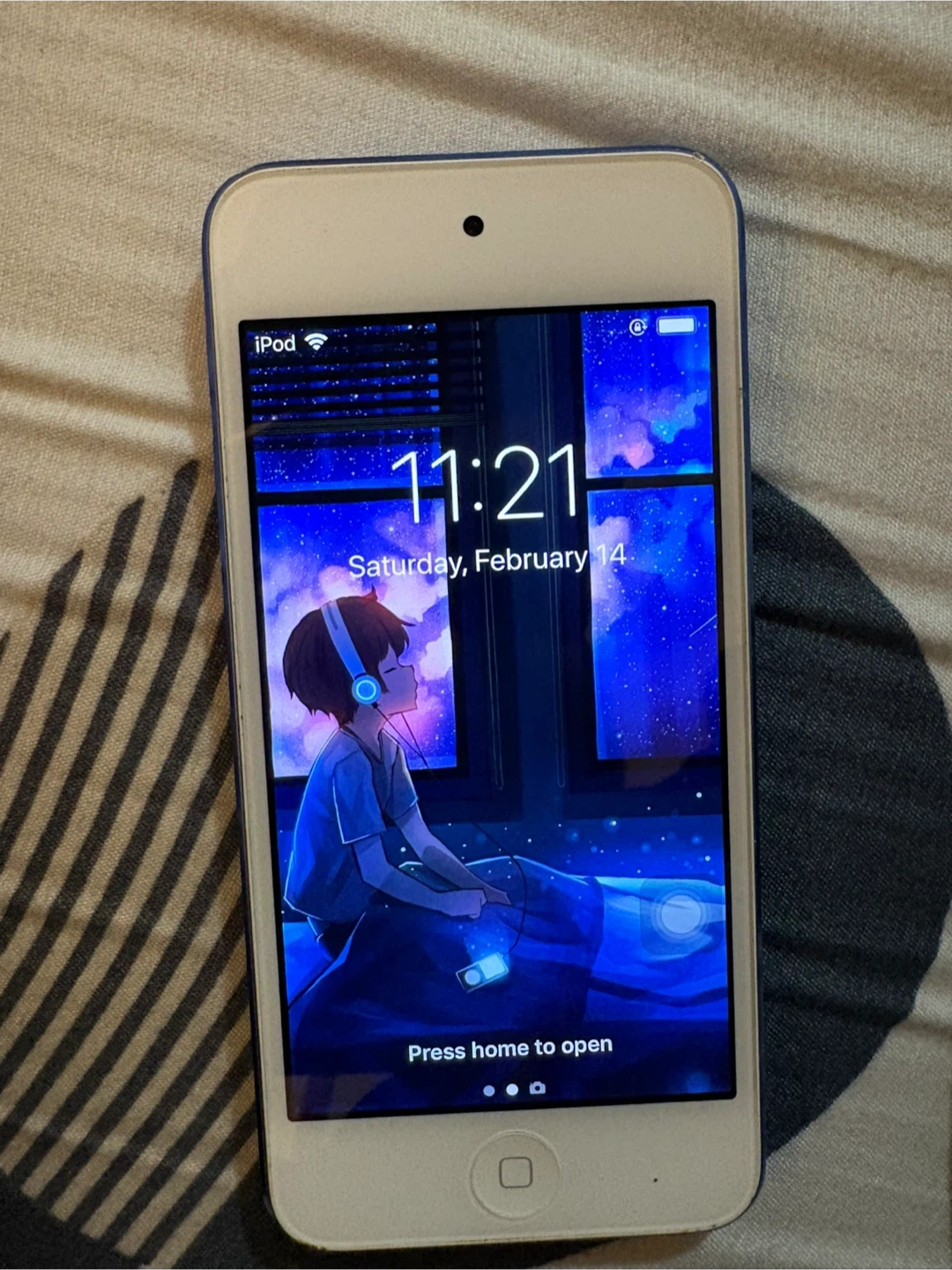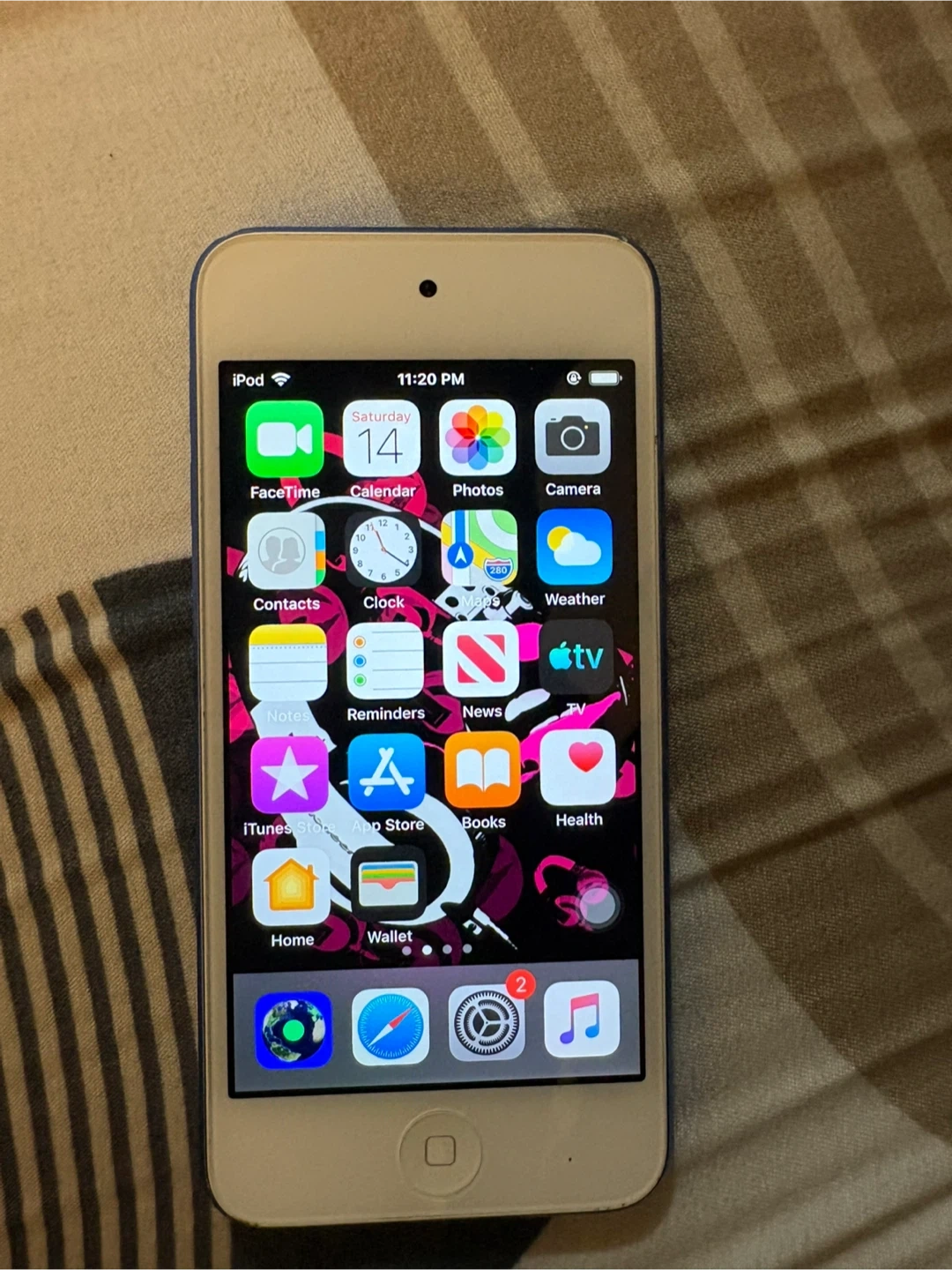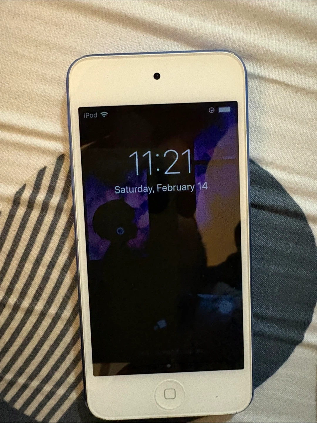 This is an Apple iPod Touch. It's blue on the back and white on the front. It's a great device for music and apps. Some wear is visible.