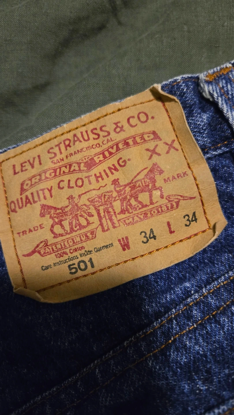 Classic Levi's 501 denim shorts in a size 34 waist. Made from 100% cotton for a comfortable fit. These shorts offer a timeless style perfect for casual wear.