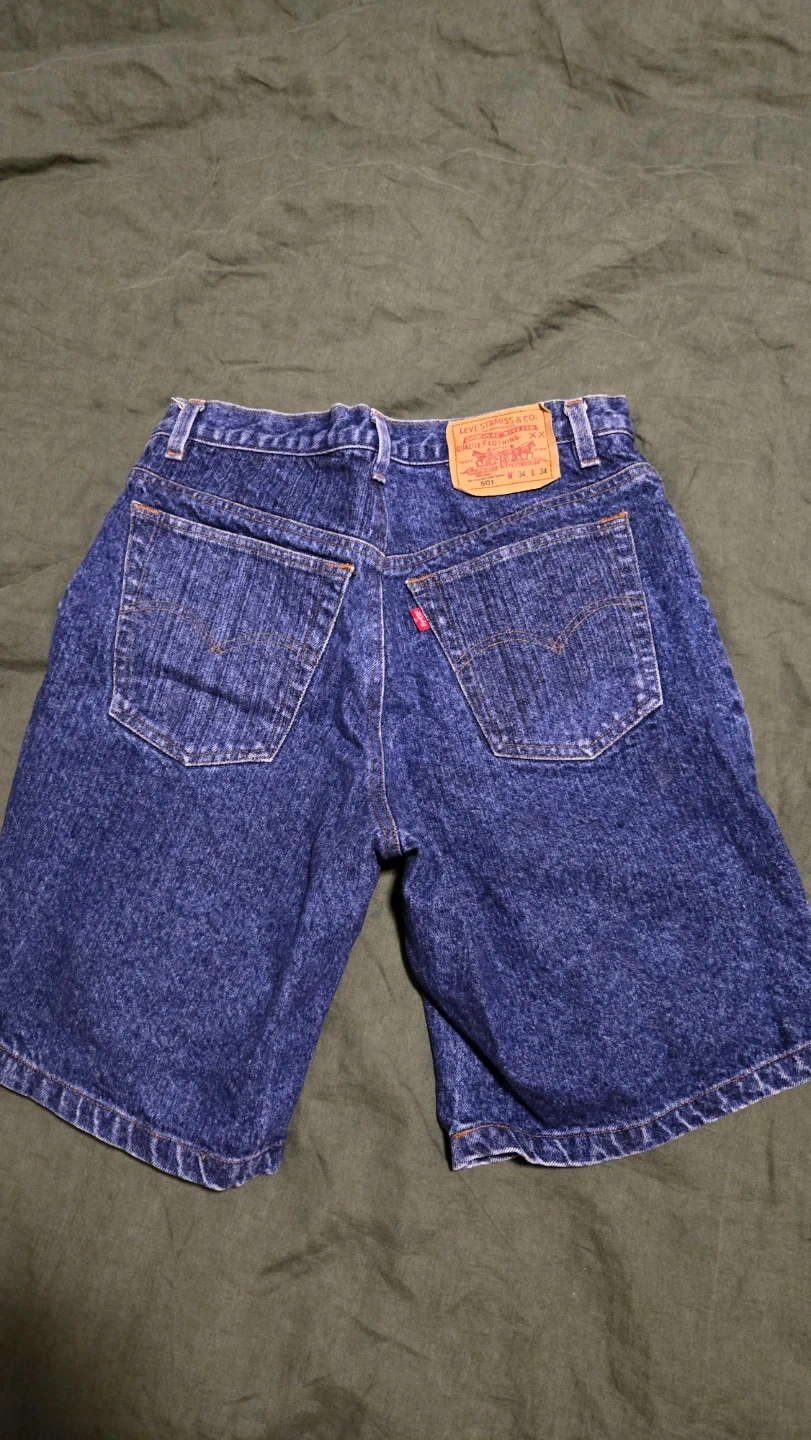 Classic Levi's 501 denim shorts in a size 34 waist. Made from 100% cotton for a comfortable fit. These shorts offer a timeless style perfect for casual wear.
