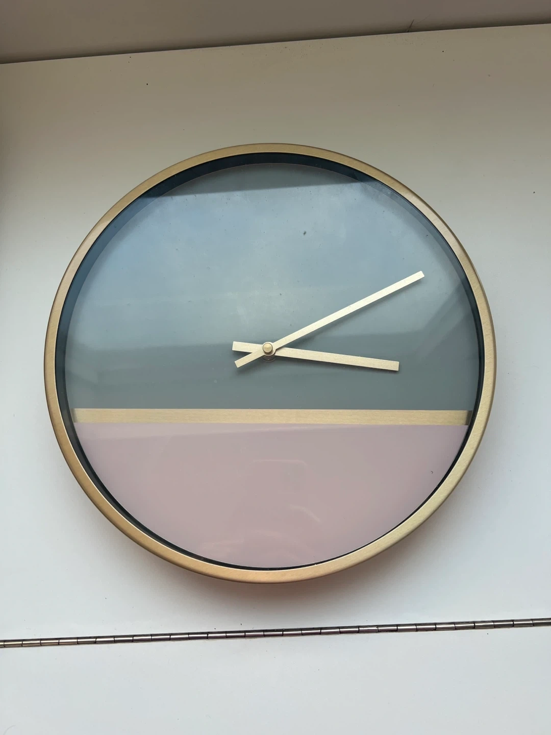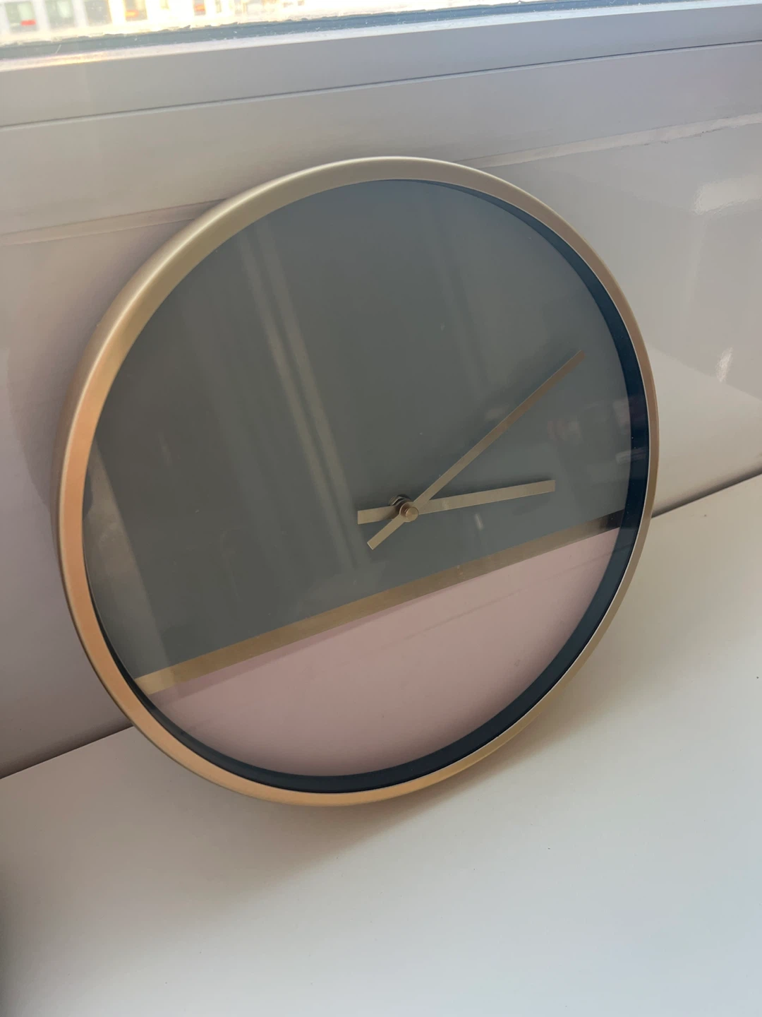 A stylish round wall clock with a modern design. It features a gold-tone metal frame and a split face with grey and pink sections. The clock is battery-operated and ready to hang.