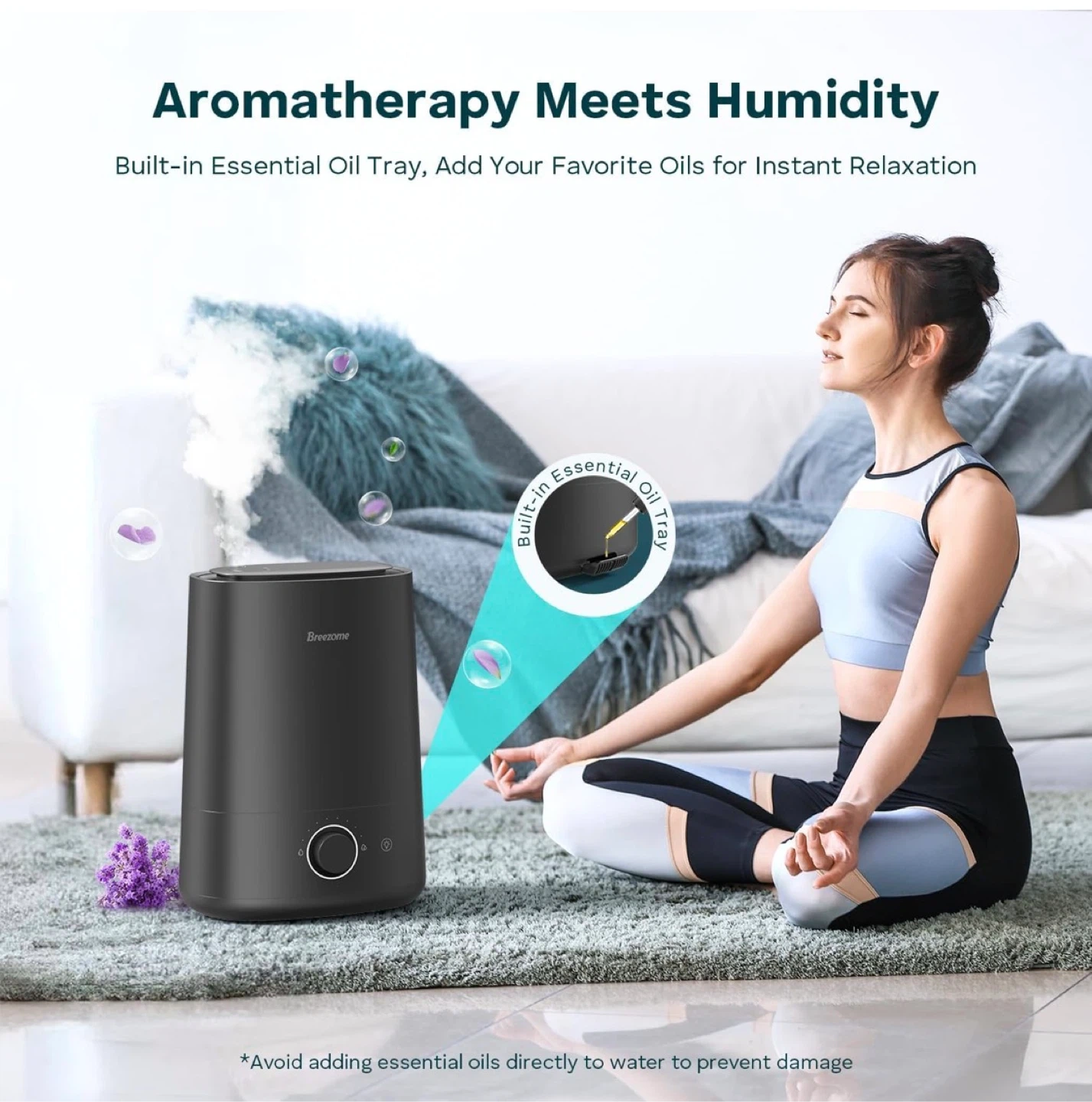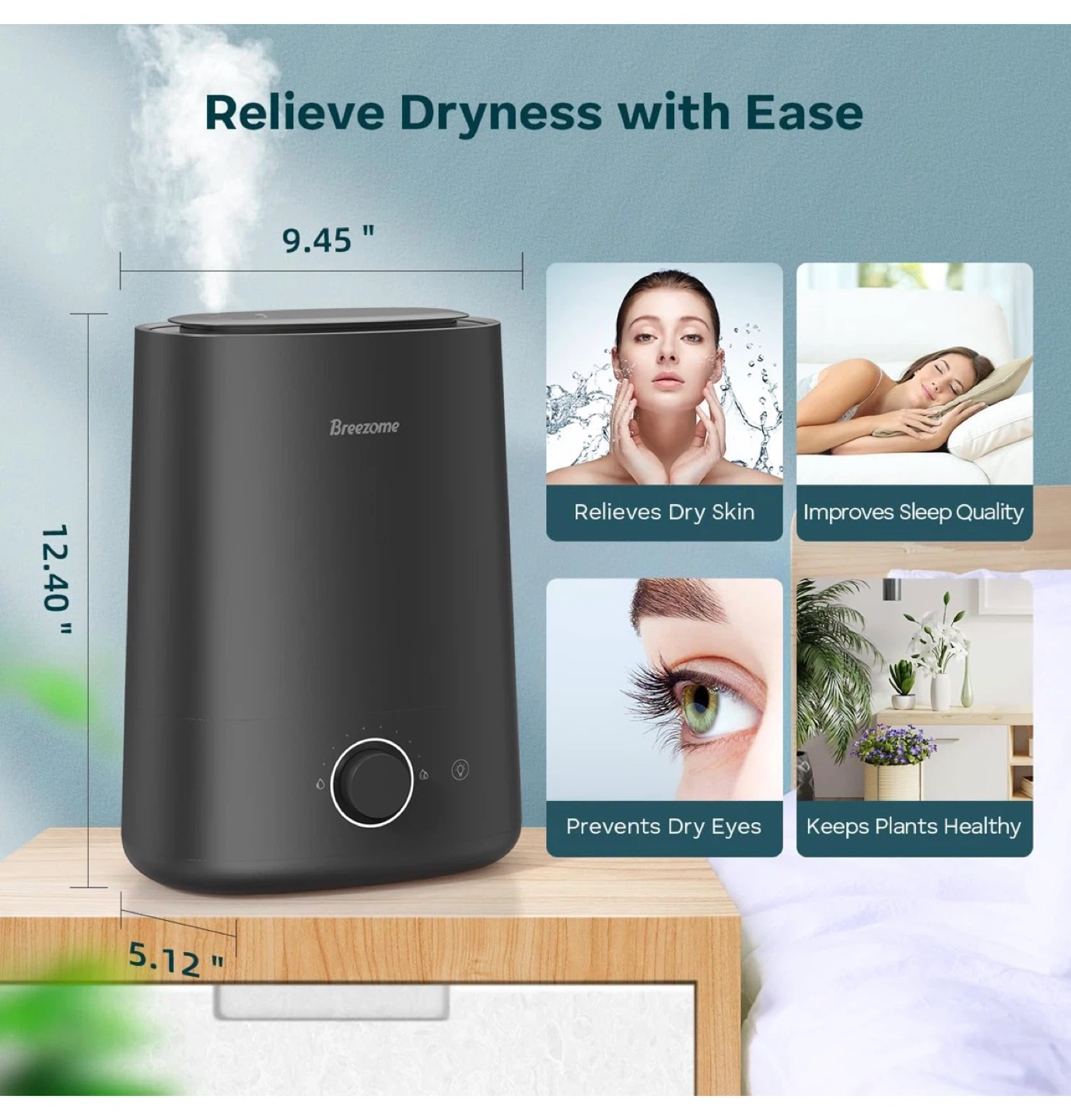 Breezome ultrasonic cool mist humidifier. Relieves dryness with ease and improves sleep quality. Features a 360° rotatable nozzle and an essential oil tray for aromatherapy. This humidifier has a 9.45" width, 12.40" height, and 5.12" depth.