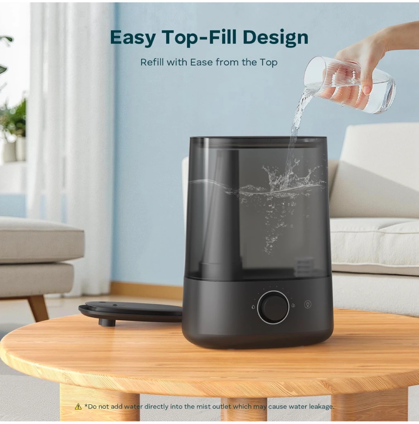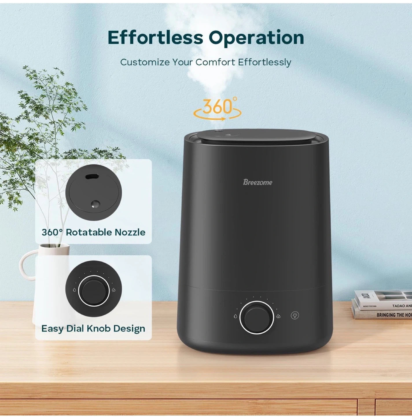 Breezome ultrasonic cool mist humidifier. Relieves dryness with ease and improves sleep quality. Features a 360° rotatable nozzle and an essential oil tray for aromatherapy. This humidifier has a 9.45" width, 12.40" height, and 5.12" depth.