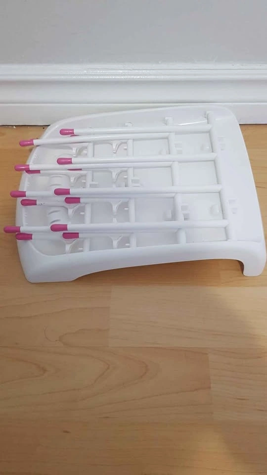 Clean Munchkin baby bottle drying rack. White with pink tips. Great for drying bottles, nipples, and other baby feeding accessories. Has lots of pegs for air drying.