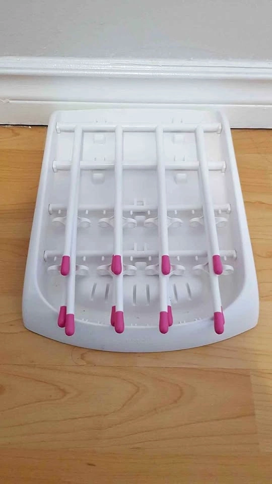 Clean Munchkin baby bottle drying rack. White with pink tips. Great for drying bottles, nipples, and other baby feeding accessories. Has lots of pegs for air drying.
