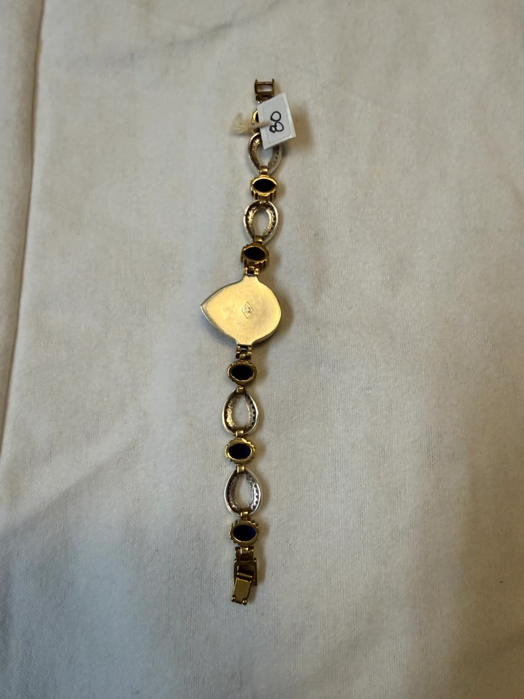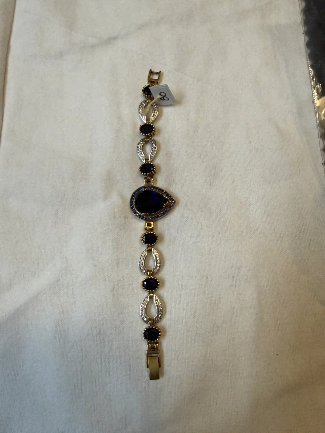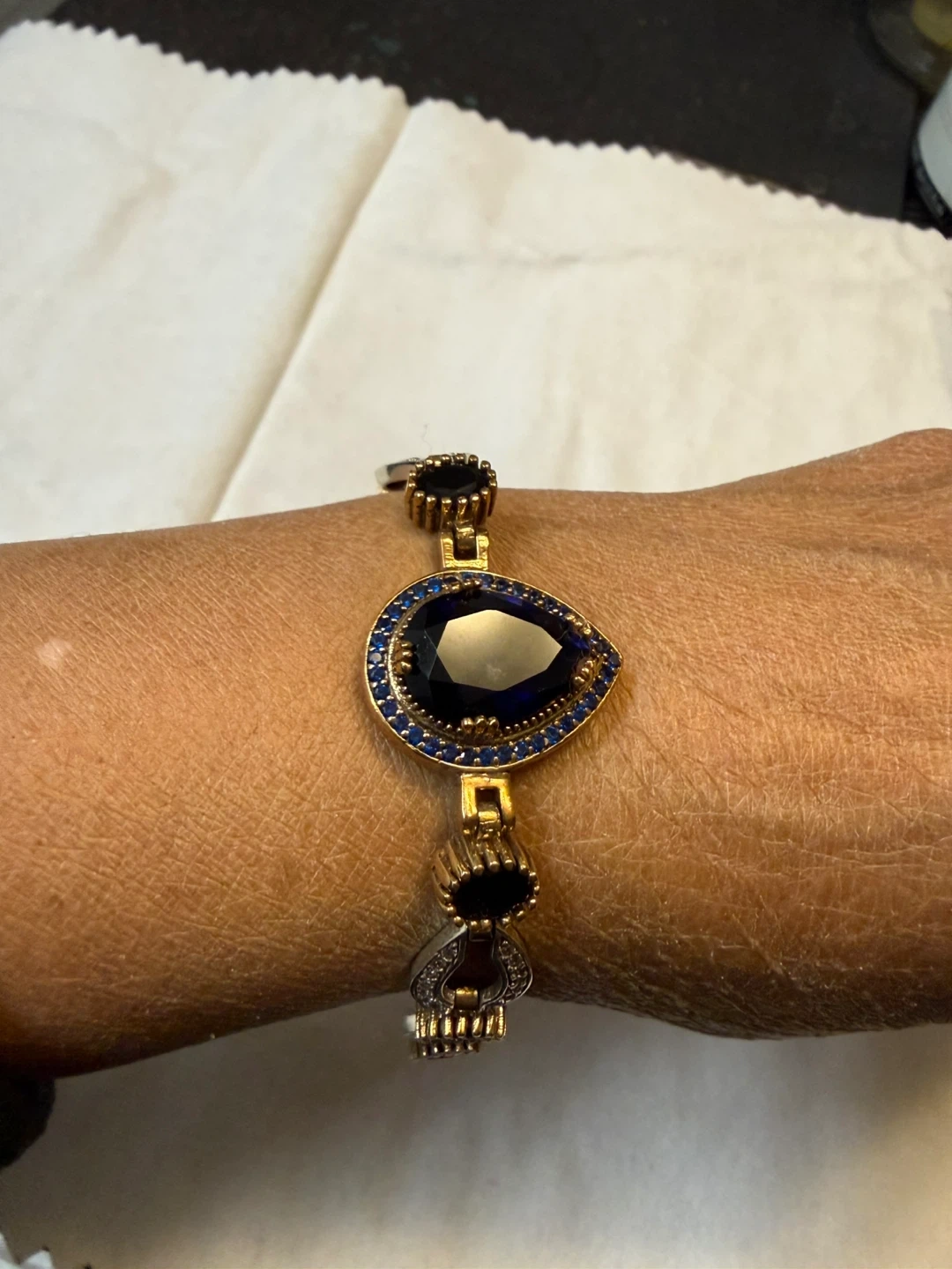 Elegant 6 3/8” bracelet featuring a large pear-shaped blue stone surrounded by smaller blue stones. The back of the main stone shows a '925' stamp, 925 stamped and copper 6 3/8” Bracelet with Blue Stones sterling silver with copper. It's a beautiful statement piece!