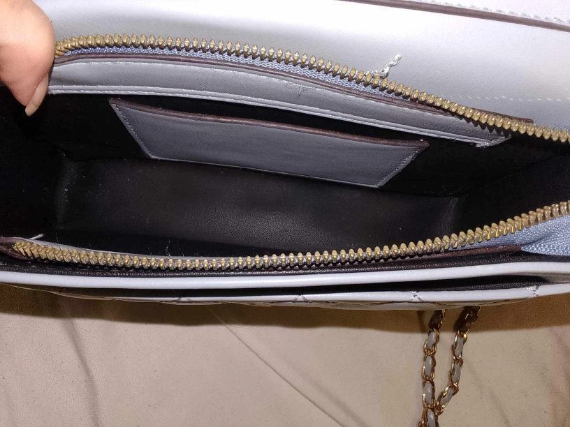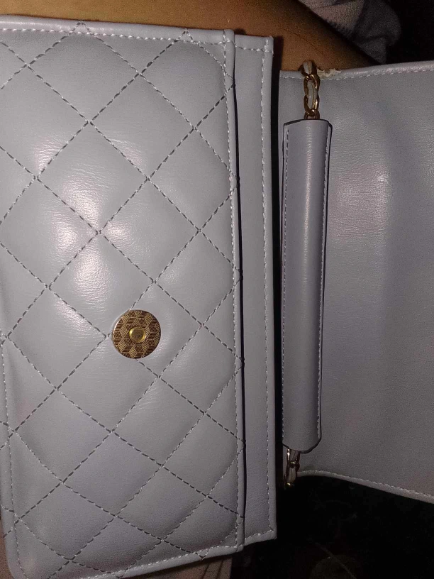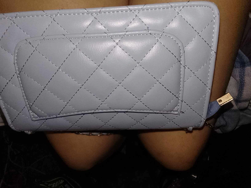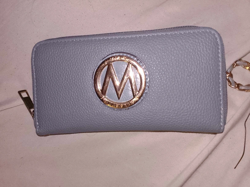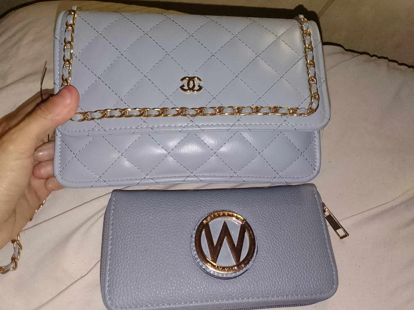 Selling a cute light blue crossbody bag and matching wallet set. The bag has a gold chain strap and a quilted design. The wallet has a zip closure and a stylish logo. Both are in great condition and perfect for everyday use!