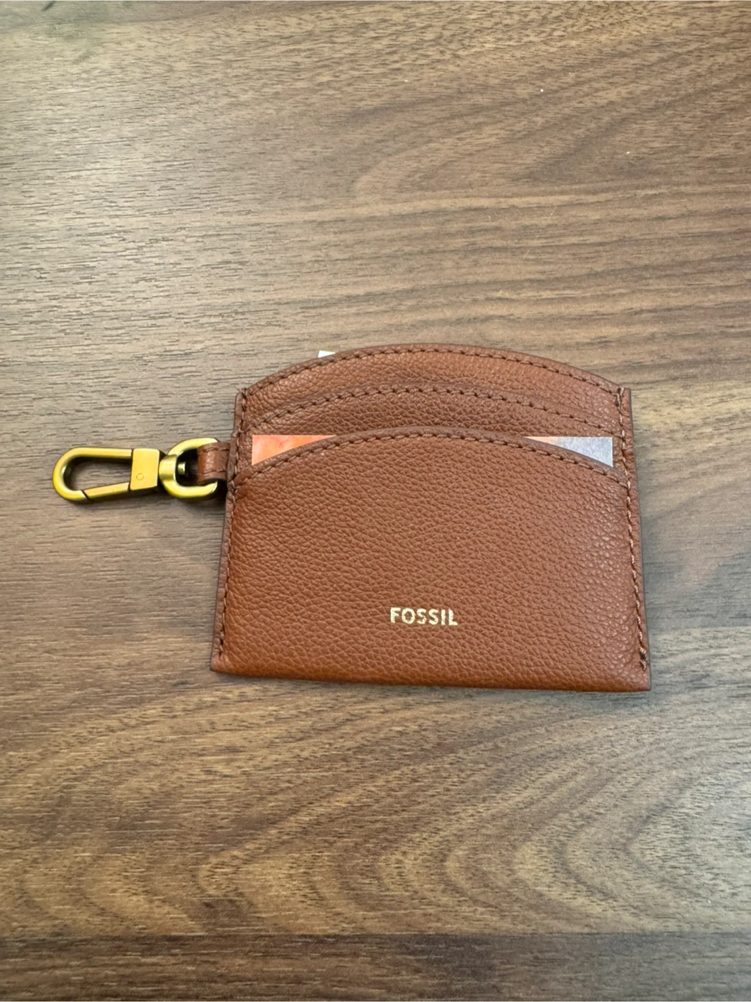 This is a Fossil card holder in brown leather. It's perfect for keeping your cards organized and easily accessible. The card holder also features a gold-tone clip.
