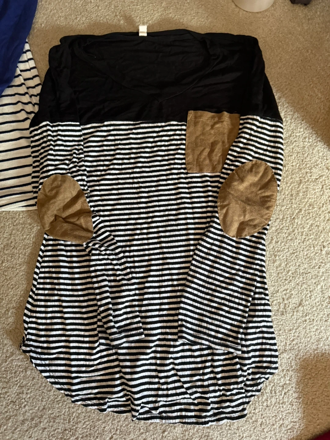 Black and white striped long sleeve shirt with a black top portion. It features a faux suede patch pocket on the chest and elbow patches. Material is soft and comfortable.