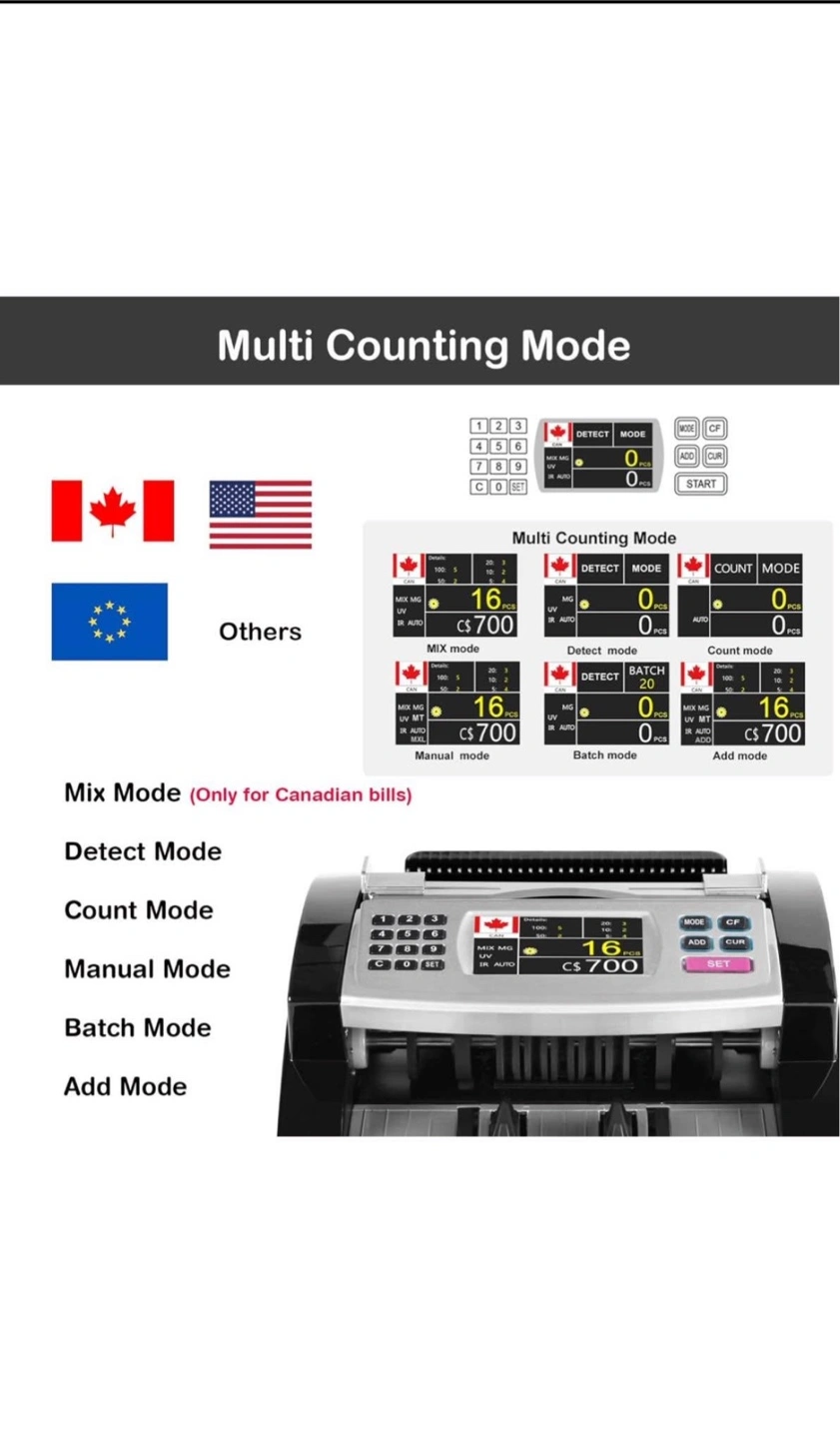 ⭐【MULTIPLE FUNCTIONS】For Canadian dollars: Mixed Denomination Mode/Sort Mode/Count Mode/Detect Mode; For US Dollar, EURO, and others: /Count Mode/Detect Mode