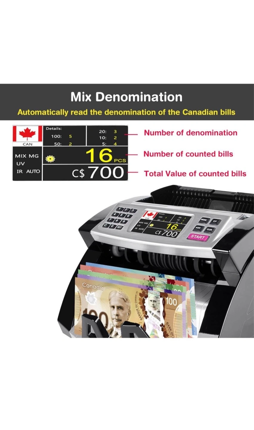 ⭐【MIXED DENOMINATION FUNCTION】The money counting machine is a Mixed Denomination that automatically reads the denomination of the Canadian bills and shows the total value and pcs of the counted bills. 🚩 Doesn’t detect Denomination for USD and others Currency
