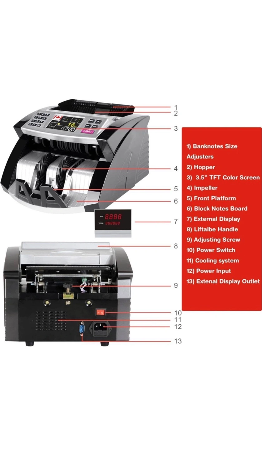 ⭐ 【PACKAGING】*Bill Counter Machine, *Power cable, * Cleaning Brush, * External display, * Spare Fuse, * User manual, *Conveyor belt, *Dust Cover