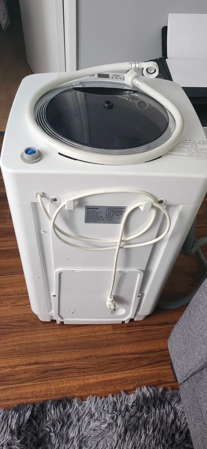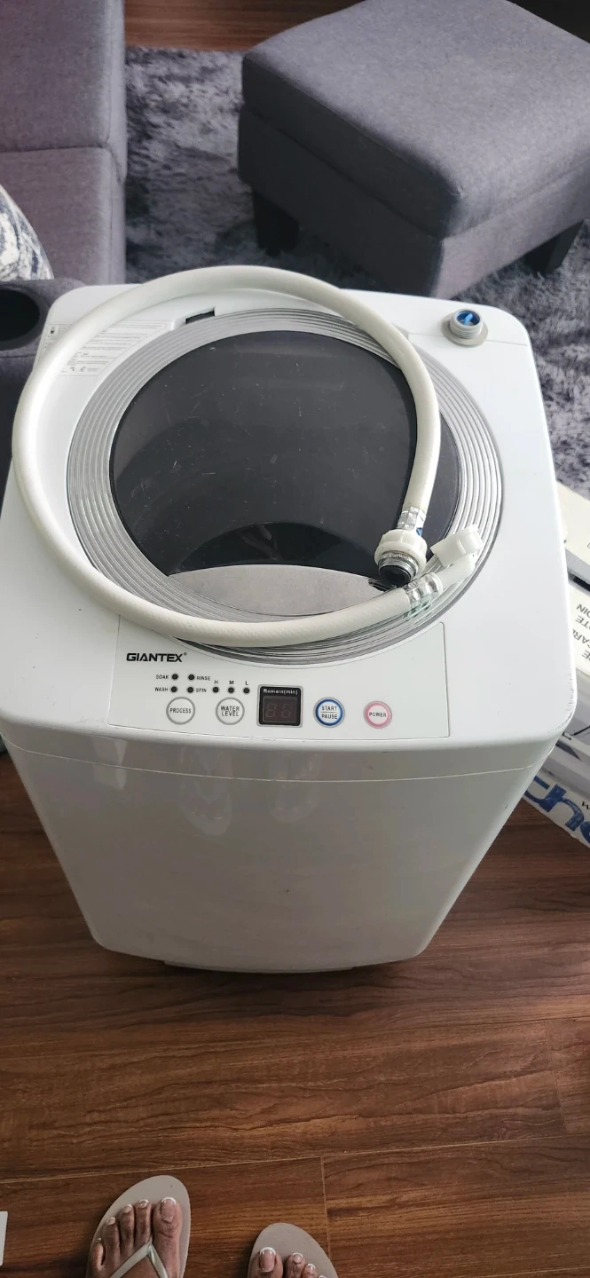 This is a GIANTEX portable washing machine. It comes with a water inlet hose and a drain hose. It features multiple wash settings including soak, wash, and spin.