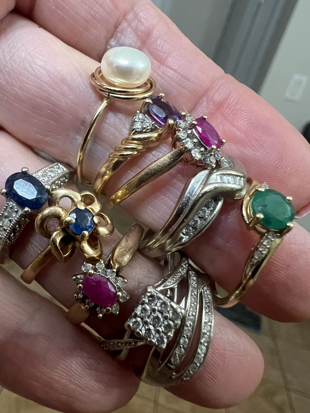This lot includes ten rings featuring various gemstones like emeralds, rubies, sapphires, and amethysts, along with diamonds. Most rings are 10k gold, with a few 14k options. Sizes range from 4.5 to 7.5. It's a nice collection for anyone who loves unique rings!