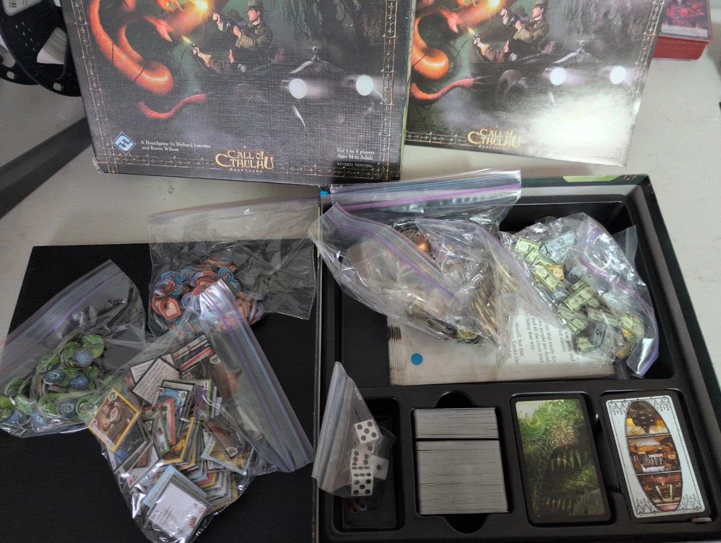 This is the Arkham Horror board game, revised printing. It's for 1 to 8 players, ages 14 to Adult. The game includes 1 Rule Book, 1 Game Board, and 12 Investigator Mats. It's a classic game of Lovecraftian adventure.