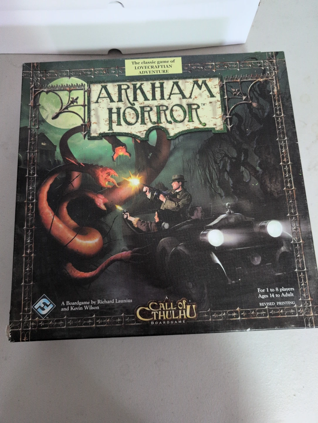 This is the Arkham Horror board game, revised printing. It's for 1 to 8 players, ages 14 to Adult. The game includes 1 Rule Book, 1 Game Board, and 12 Investigator Mats. It's a classic game of Lovecraftian adventure.
