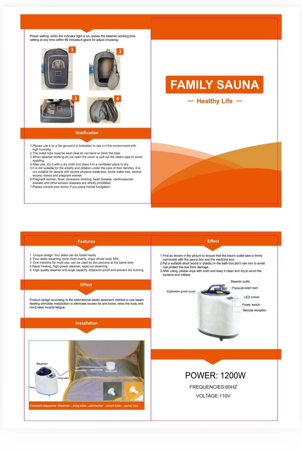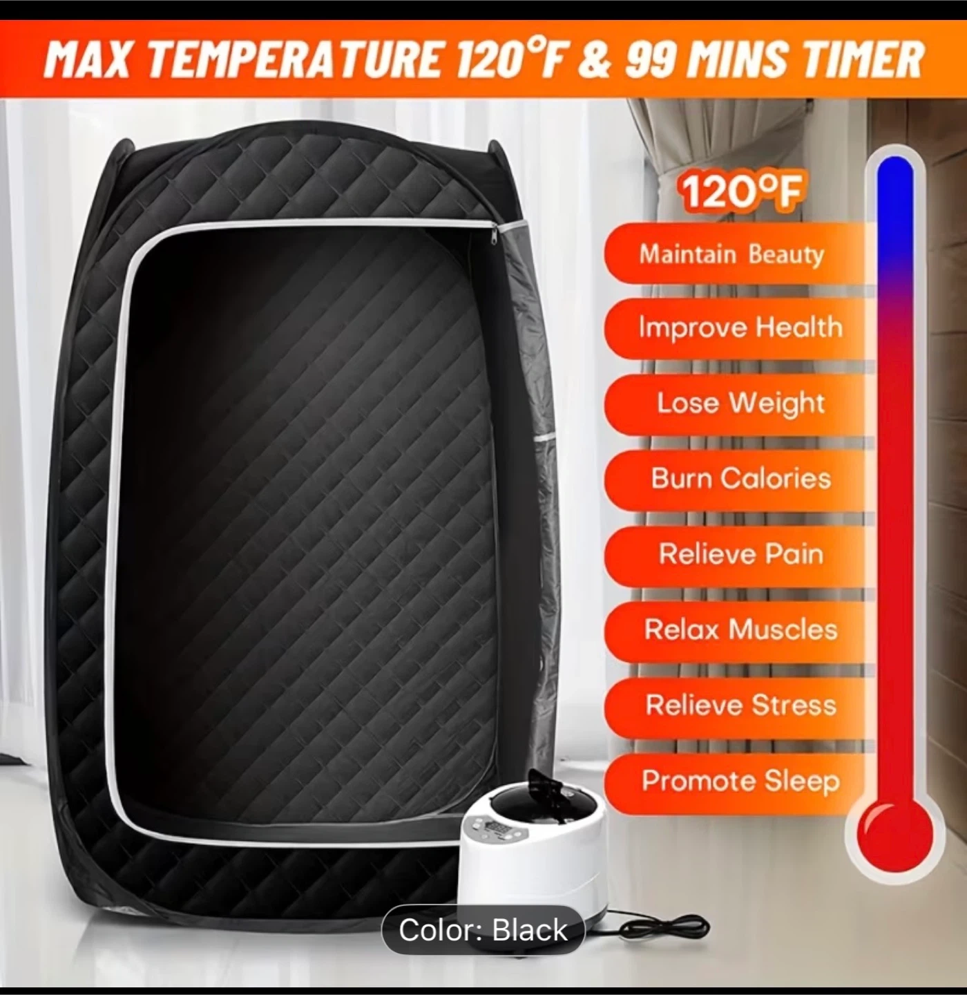 This portable sauna kit includes a black tent and a 1000W steamer unit. The tent measures 80cm x 80cm x 136cm and features a stainless steel inner lining. Max temperature is 120°F with a 99-minute timer. It's great for home use!