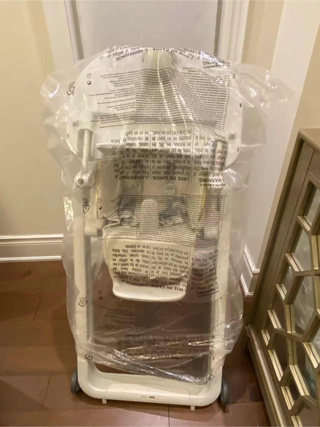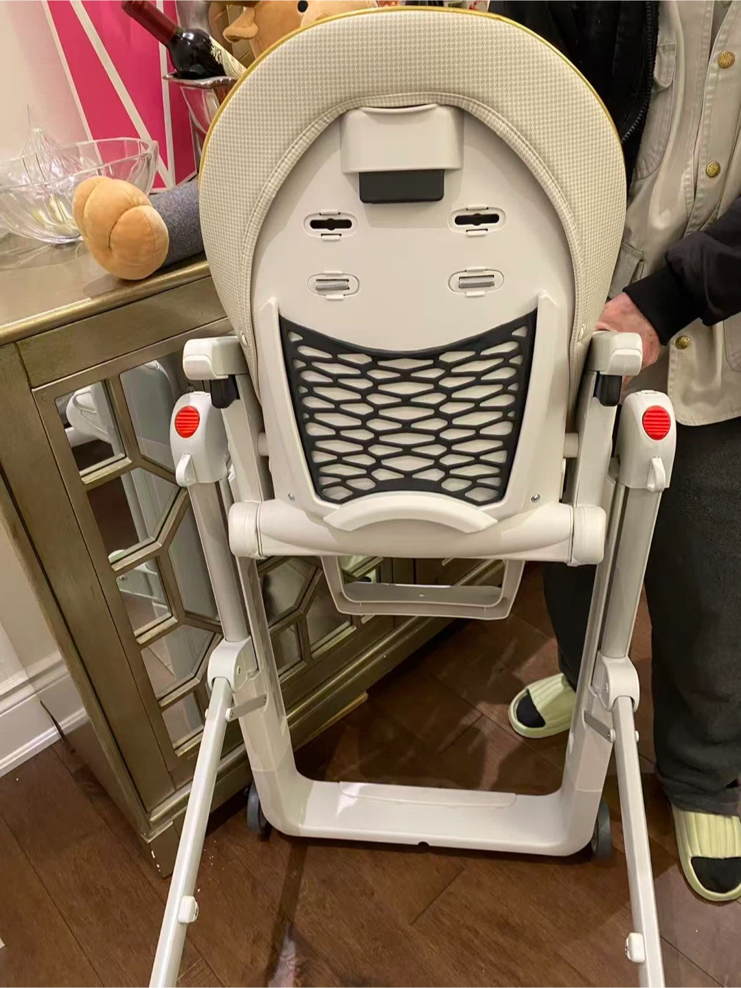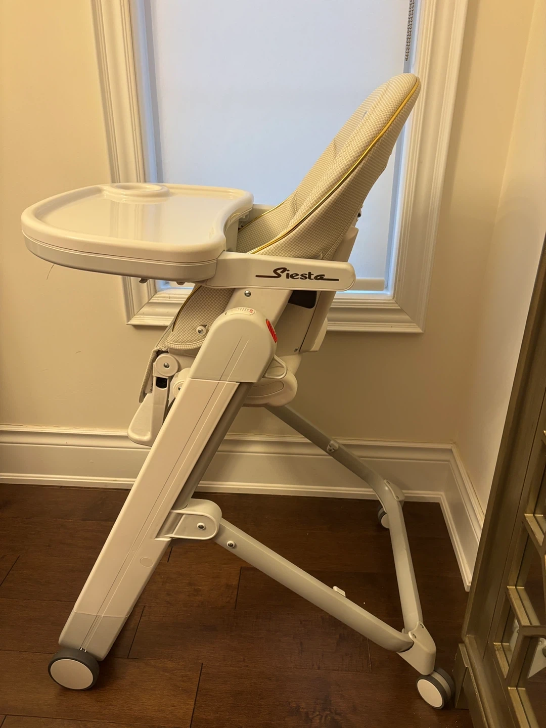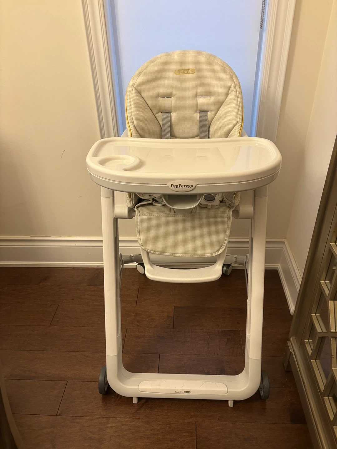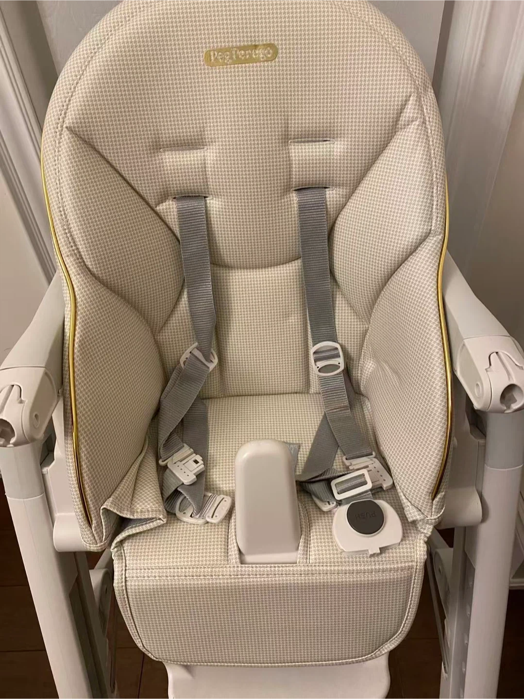 Peg Perego Siesta high chair in a cream plaid pattern. It has a removable tray with a cup holder and adjustable footrest. The seat comes with a 5-point harness for safety. This chair is designed for babies and toddlers.