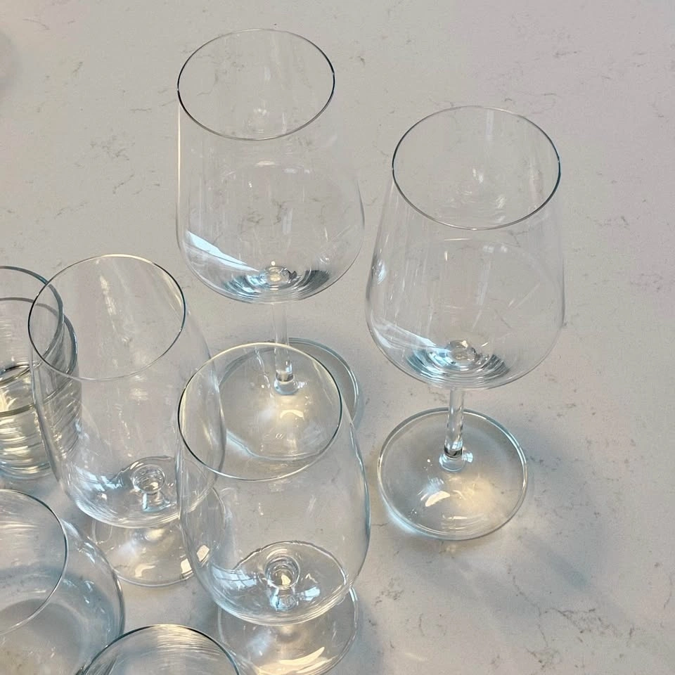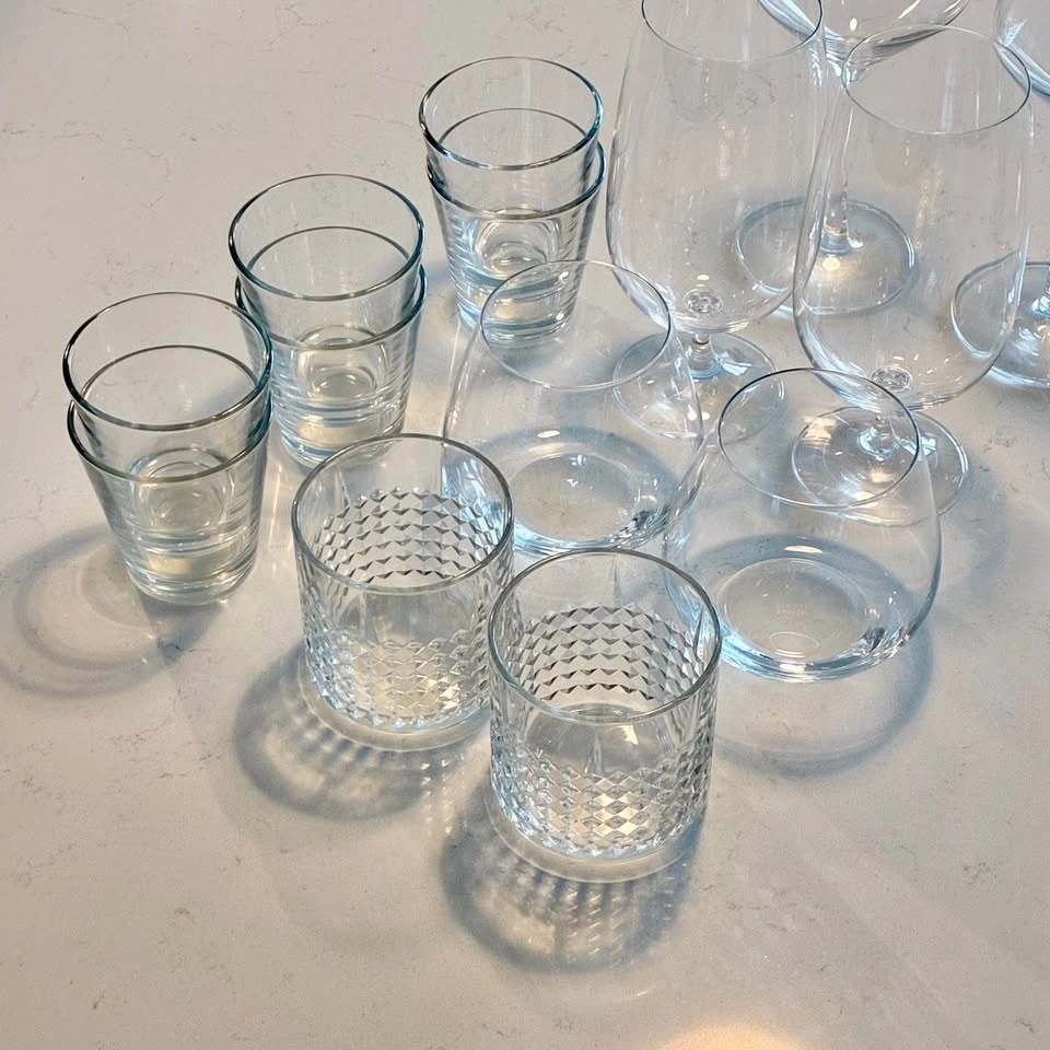 Versatile glassware set with a mix of stemmed wine glasses, stemless tumblers, and regular tumblers. Also includes a couple of cool textured tumblers. Total of 14 glasses. Great for entertaining or everyday use.