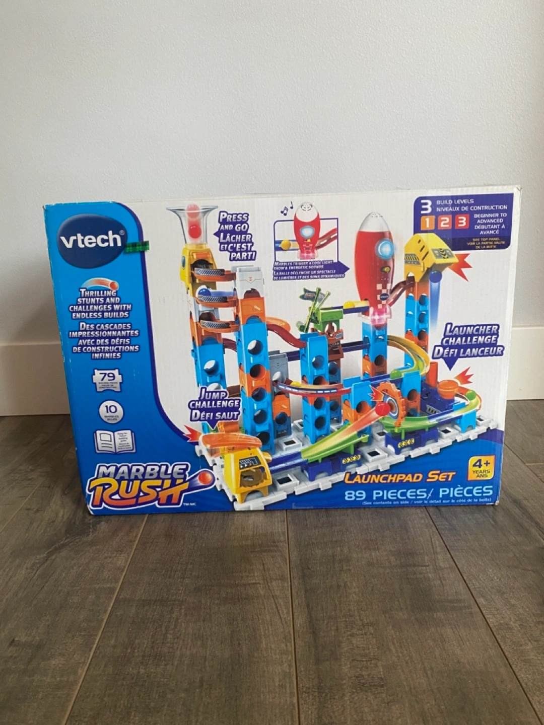 VTech Marble Rush Launchpad Set with 89 pieces. Includes thrilling gravity-defying challenges. Recommended for ages 4+.