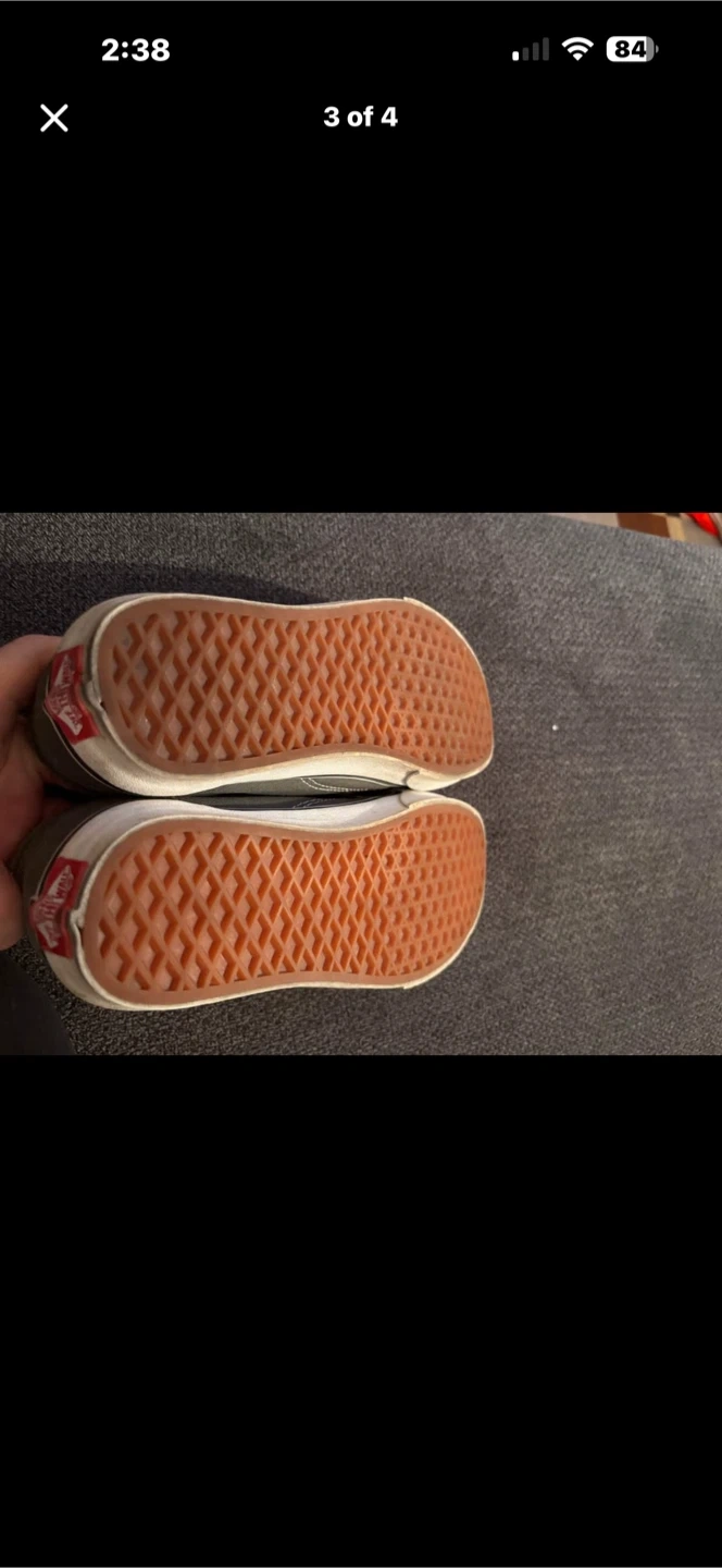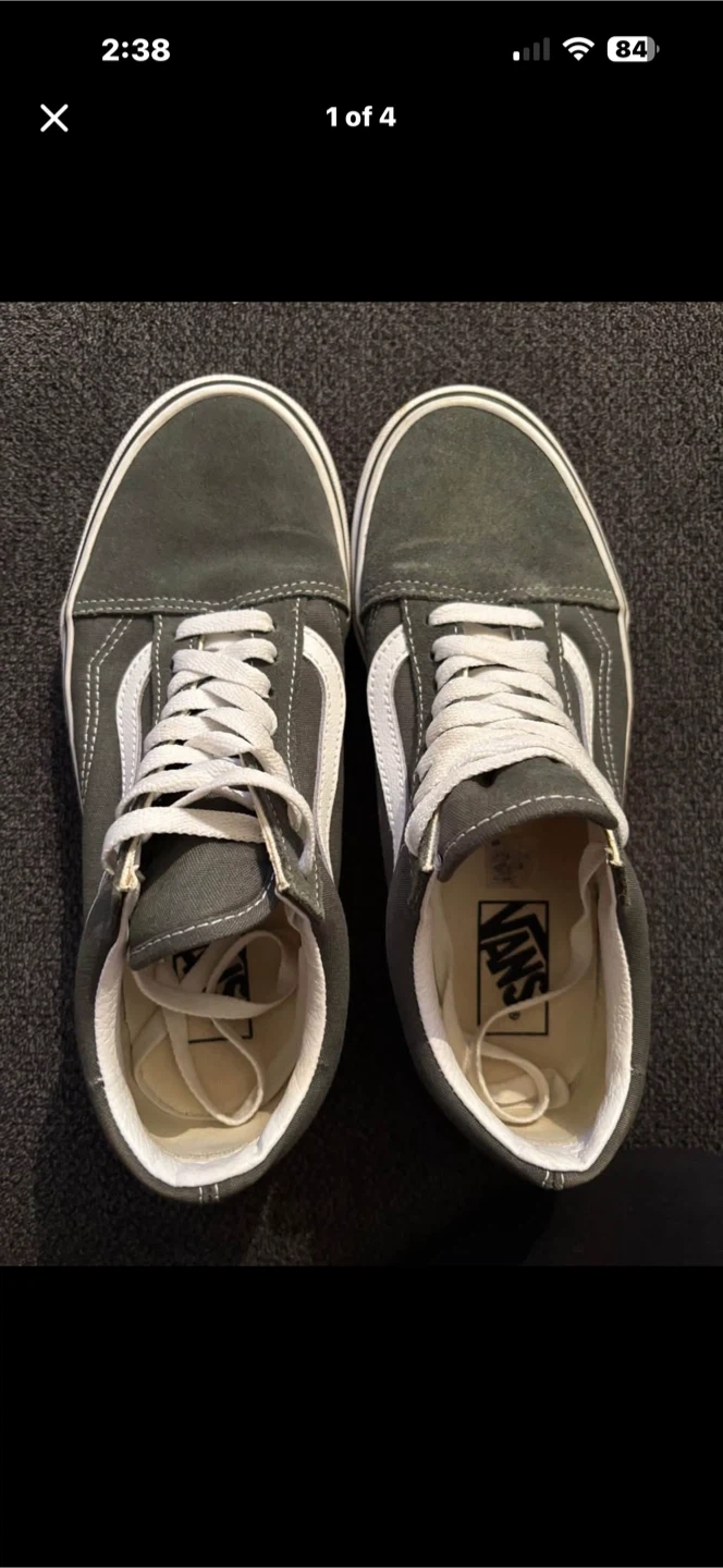 Grey Vans Old Skool sneakers with white stripe detail. Suede and canvas upper. Features the classic waffle sole. Women's US size 8