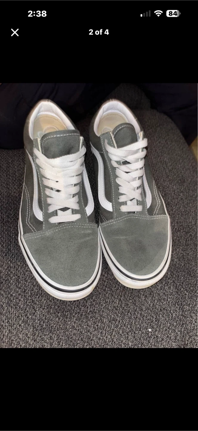 Grey Vans Old Skool sneakers with white stripe detail. Suede and canvas upper. Features the classic waffle sole. Women's US size 8