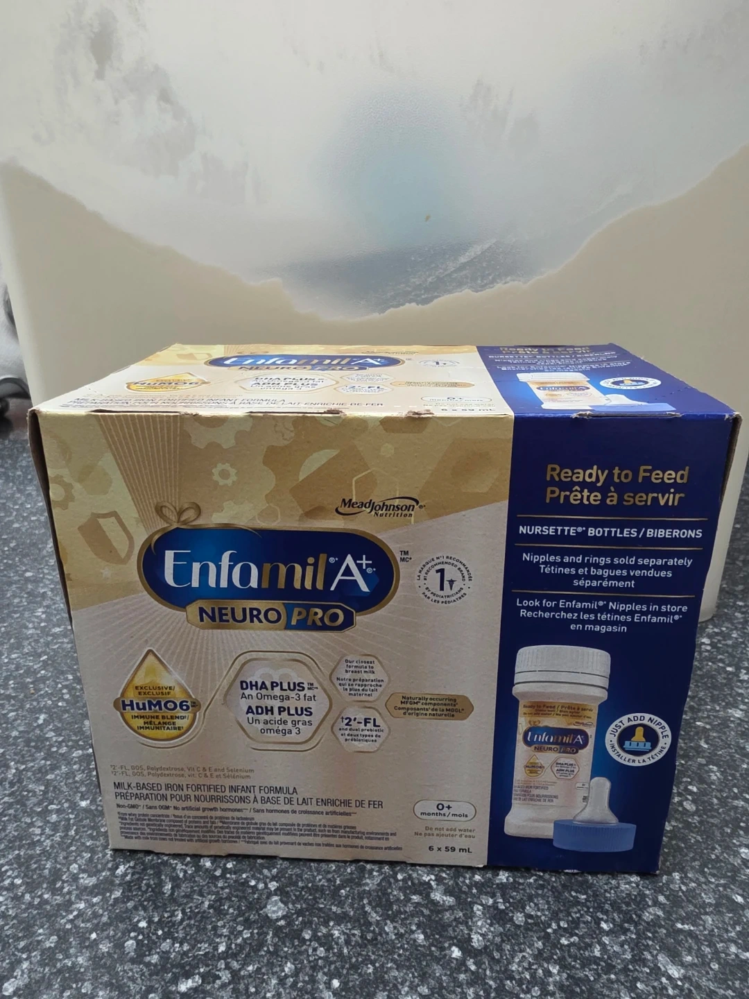 This is Enfamil A+ Neuro Pro ready-to-feed infant formula. Each bottle contains 59 mL. The expiration date is January 2026. Nipple and ring sold separately. New never opened.