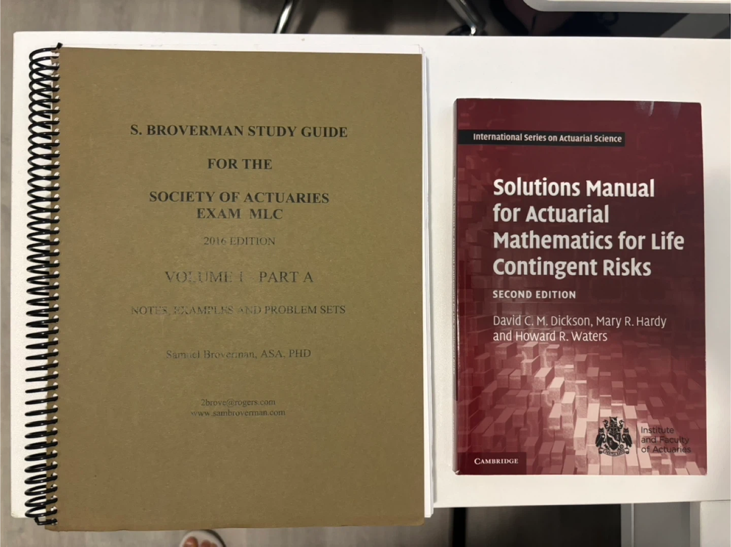 S. Broverman study guide for the Society of Actuaries Exam MLC, 2016 Edition, Volume 1 Part A. Includes notes, examples, and problem sets. Also a Solutions Manual for Actuarial Mathematics for Life Contingent Risks, Second Edition. This set is great for actuarial exam preparation!