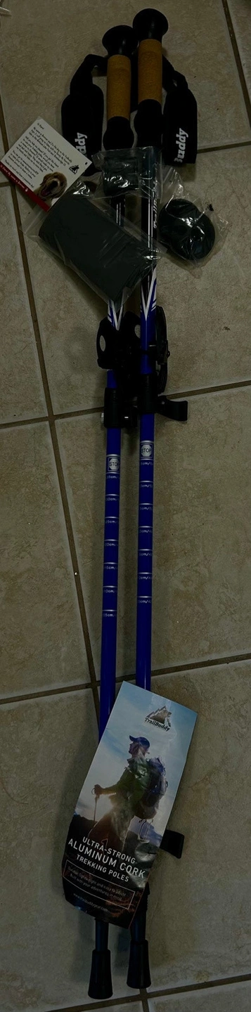 Brand new, never used TrailBuddy trekking poles. Made from lightweight aluminum with comfortable cork grips. Features a telescopic design for customized height and compact storage. Enhances stability and reduces fatigue during hiking and trekking.