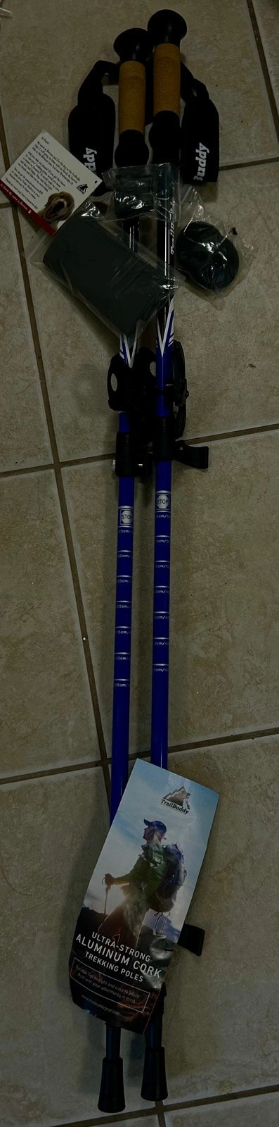 Brand new, never used TrailBuddy trekking poles. Made from lightweight aluminum with comfortable cork grips. Features a telescopic design for customized height and compact storage. Enhances stability and reduces fatigue during hiking and trekking.