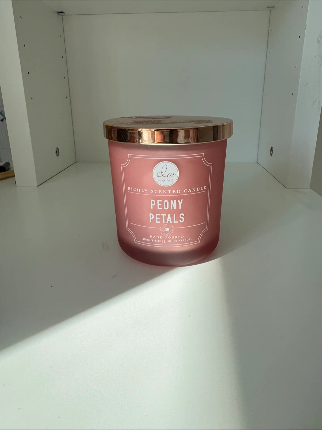 DW Home richly scented candle in Peony Petals. has a burn time of approximately 31 hours. Never used it