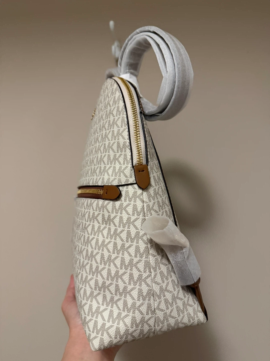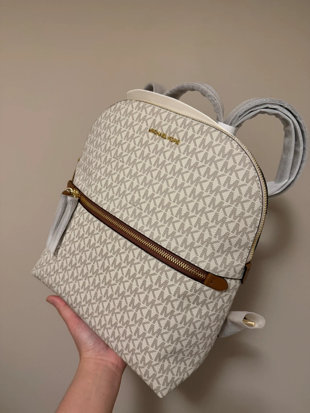 This is a brand new Michael Kors backpack with the signature logo print in Vanilla color. It features brown leather accents and gold-tone hardware. The straps are adjustable.