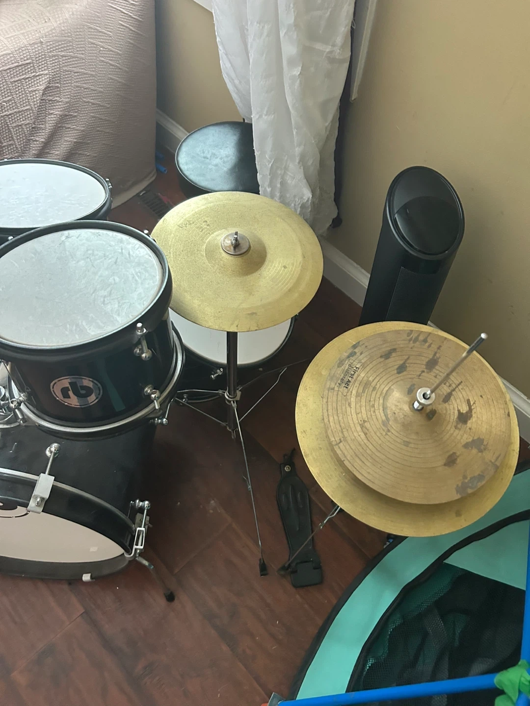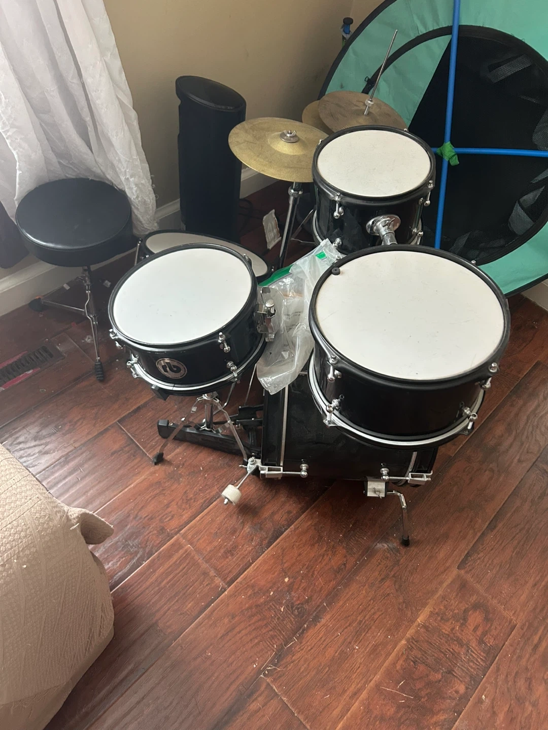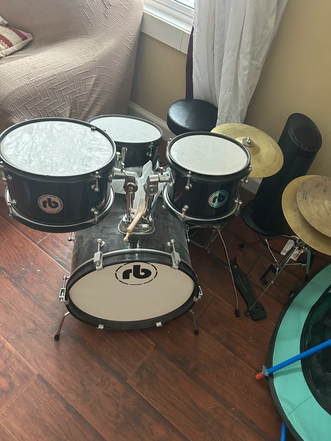 This is an RB drum kit, complete with a stool and cymbals. It's a black, four-piece drum set. This kit is suitable for beginners learning to play the drums.