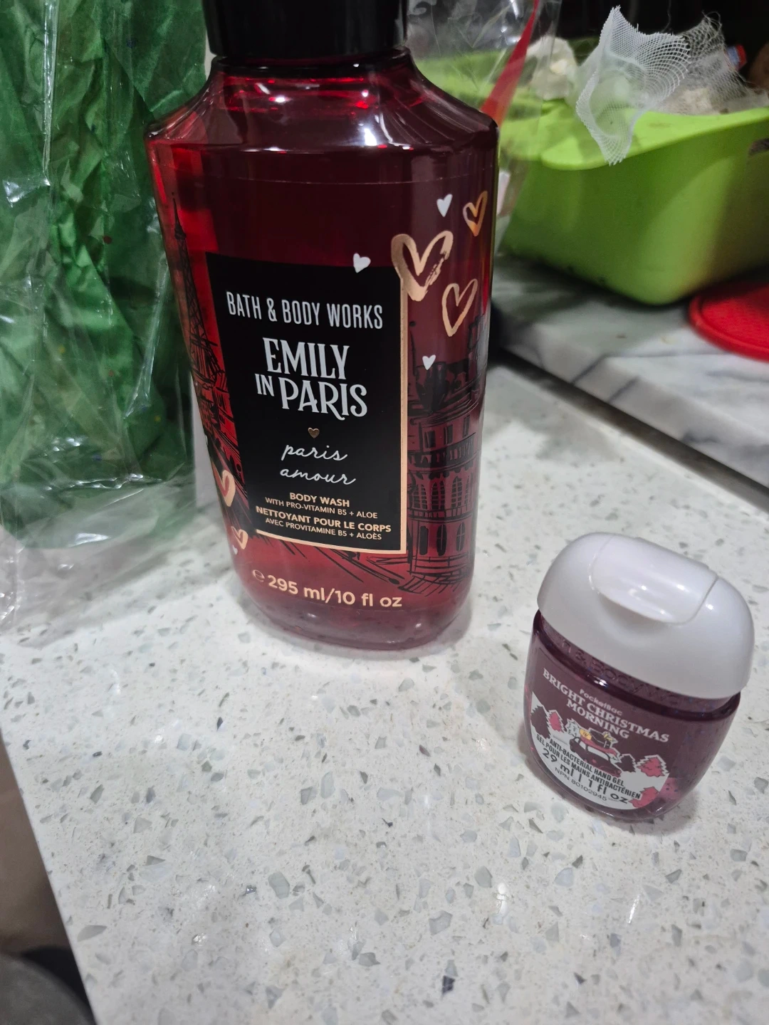Selling a Bath & Body Works Emily in Paris body wash (295ml/10 fl oz) along with a PocketBac Bright Christmas Morning anti-bacterial hand gel (29 ml/1 fl oz)