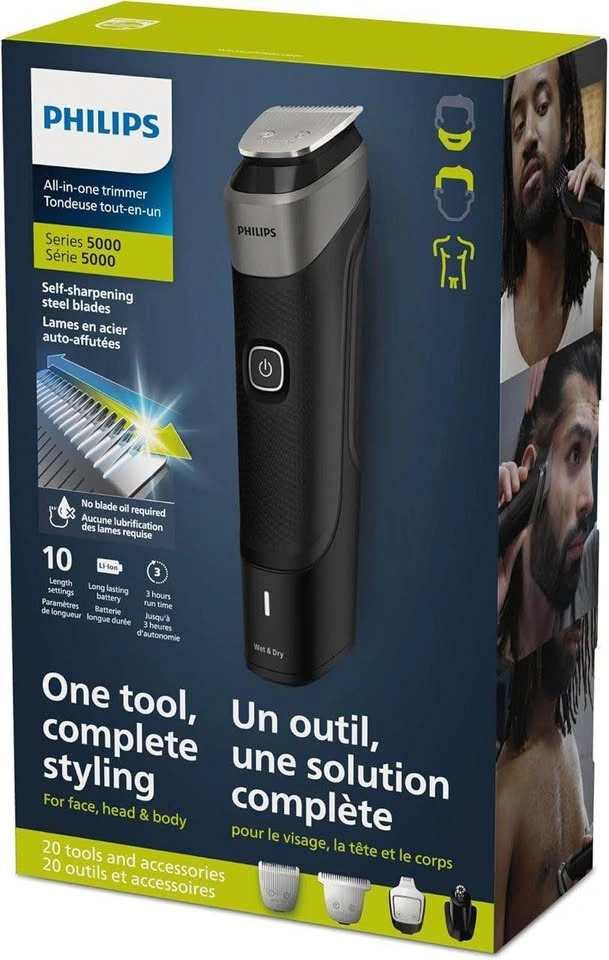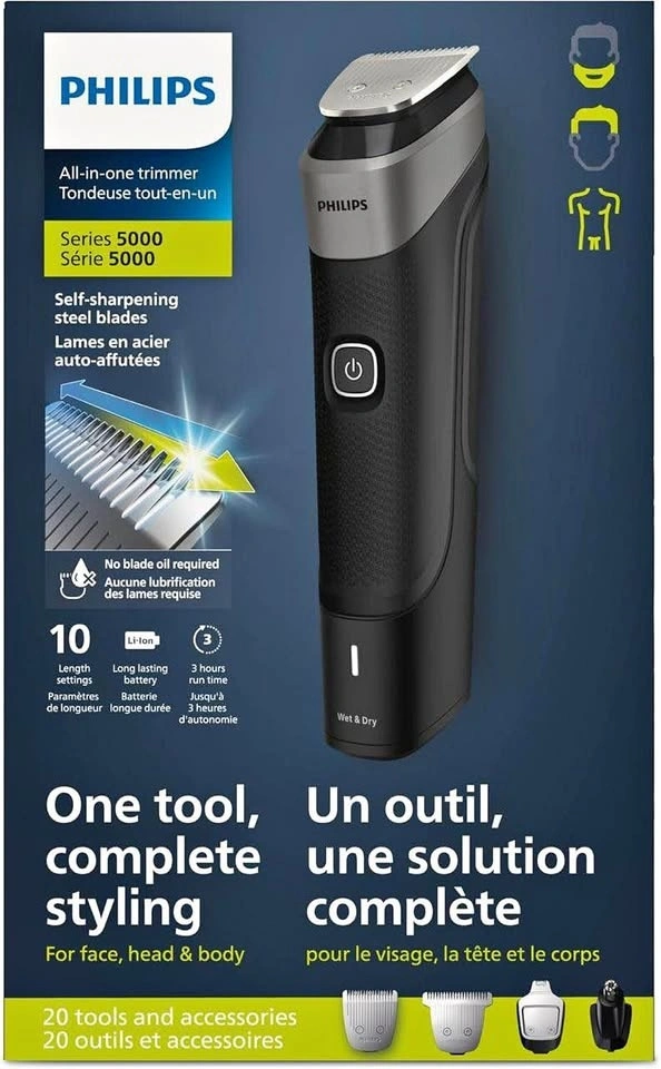 Philips Multigroom 5000 Series, 20-Piece Men's Grooming Kit for Beard, Face, Hair and Body. No blade oil needed. Model MG5910/28.