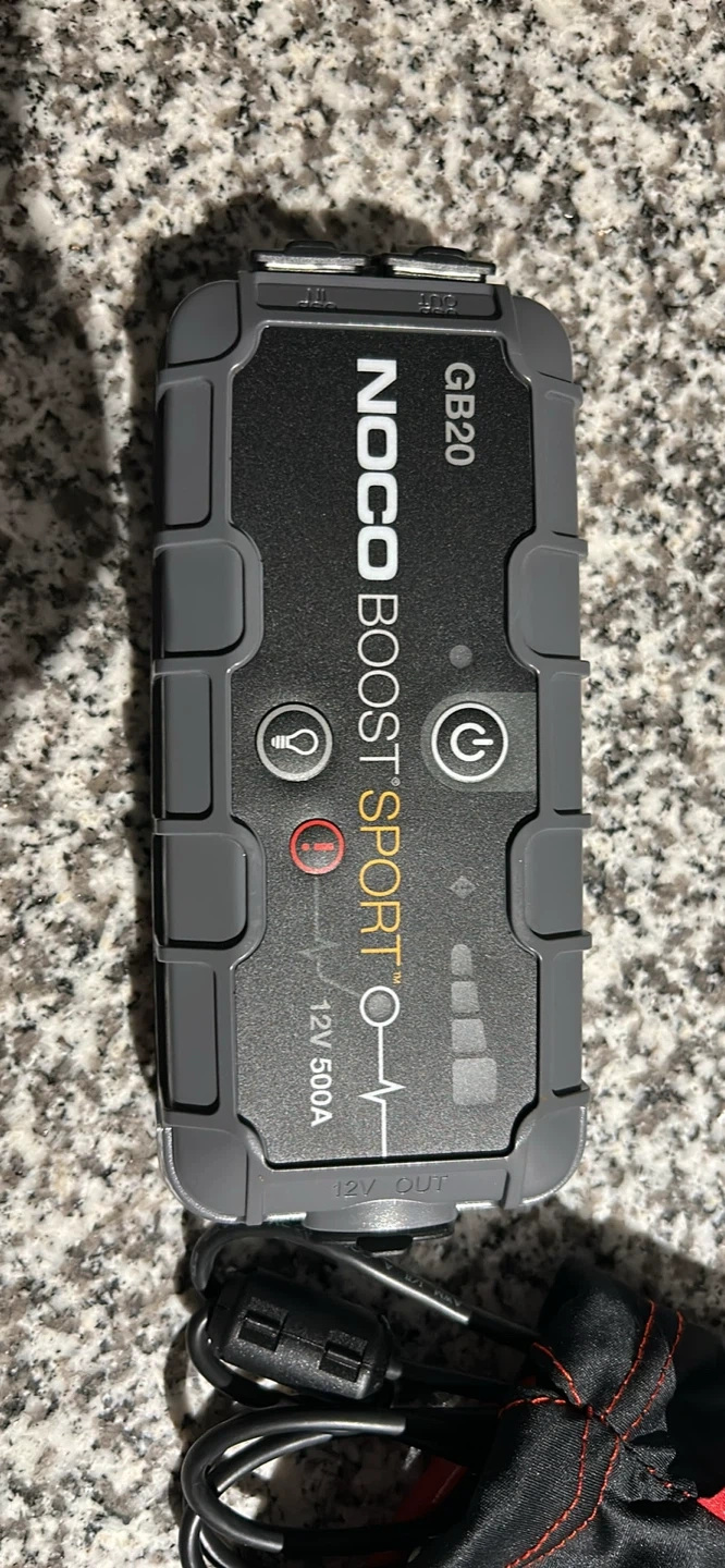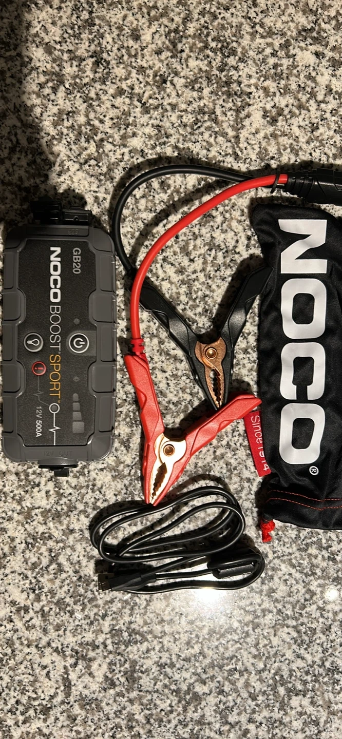 This is a NOCO GB20 Boost Sport jump starter. It's a 12V, 500A portable battery booster. Includes jumper cables, USB charging cable, and storage bag.