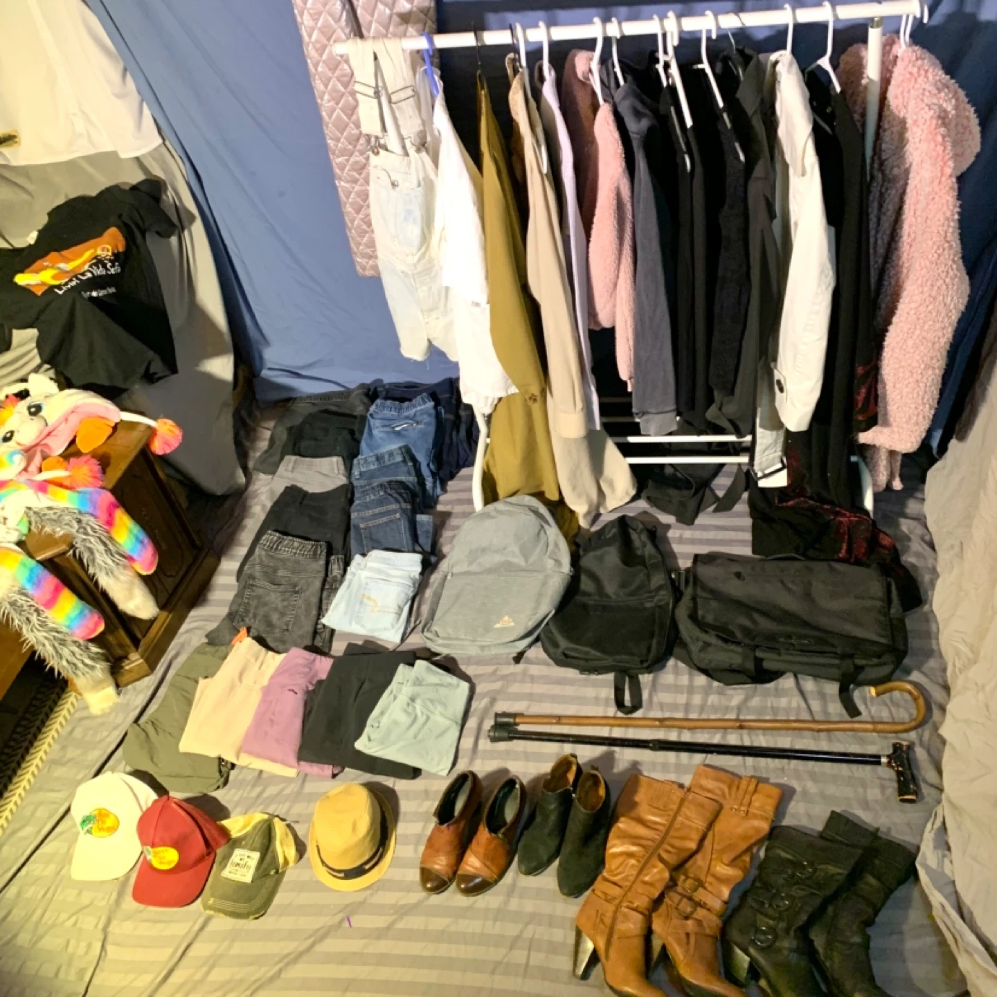 Clothing bundle including women’s clothing, men’s clothing, shoes, boots, hats, kids hats, shirts, sweaters, pants, jeans, bags, and more. Great mix of everyday fashion and accessories perfect for finding affordable items for different ages, styles, and seasons.